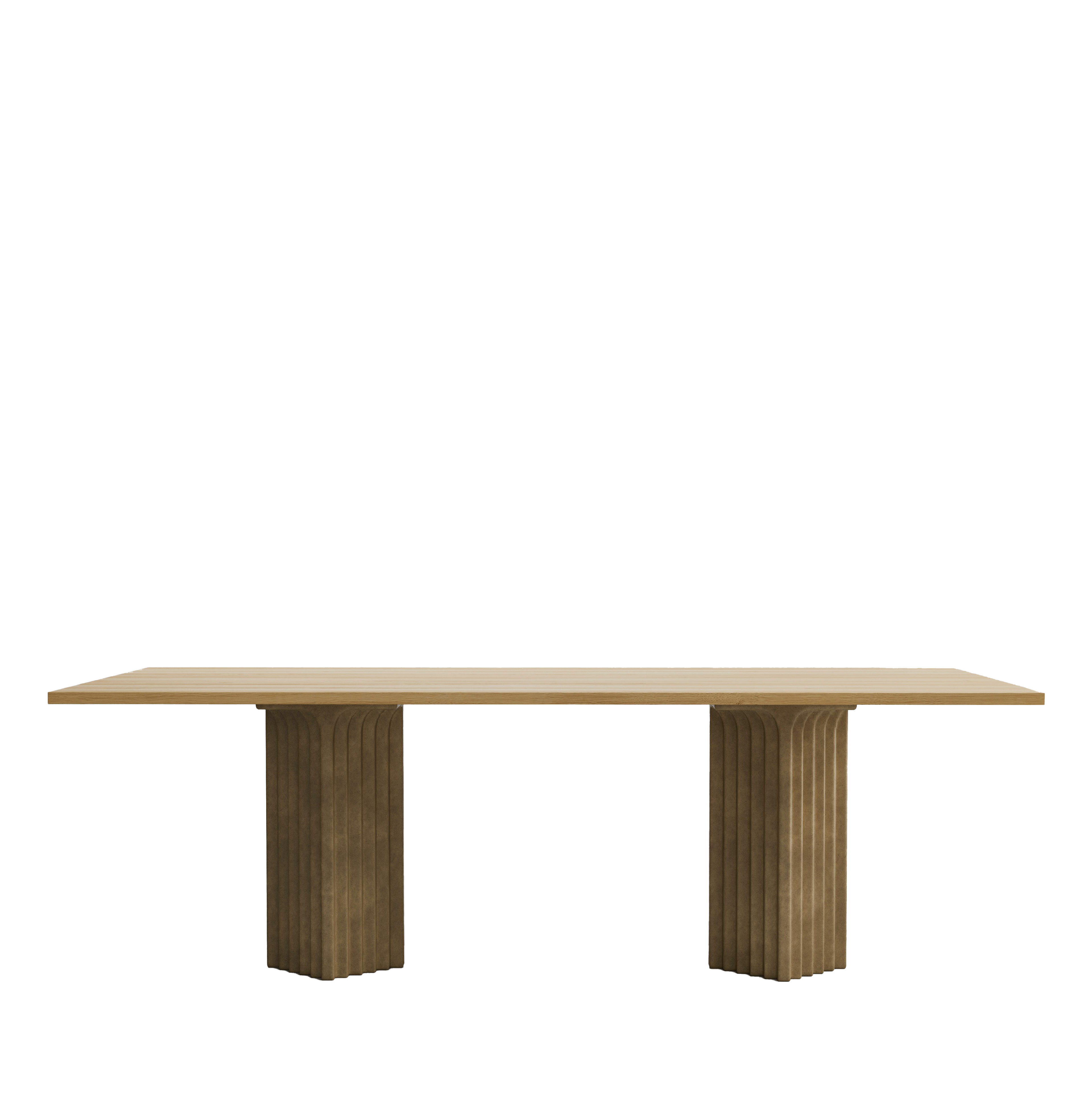 Die großzügige Länge von 250 cm macht diesen Esstisch ideal für große Essbereiche, Lofts oder stilvolle Design-Interieurs. Die Kombination aus einer edlen Eichen-Tischplatte und einem massiven, architektonisch geformten Gestell aus handbemaltem Faserbeton sorgt für ein spannendes Spiel zwischen Wärme, Struktur und Stärke – ein Meisterwerk aus Materialkontrast und handwerklicher Präzision.