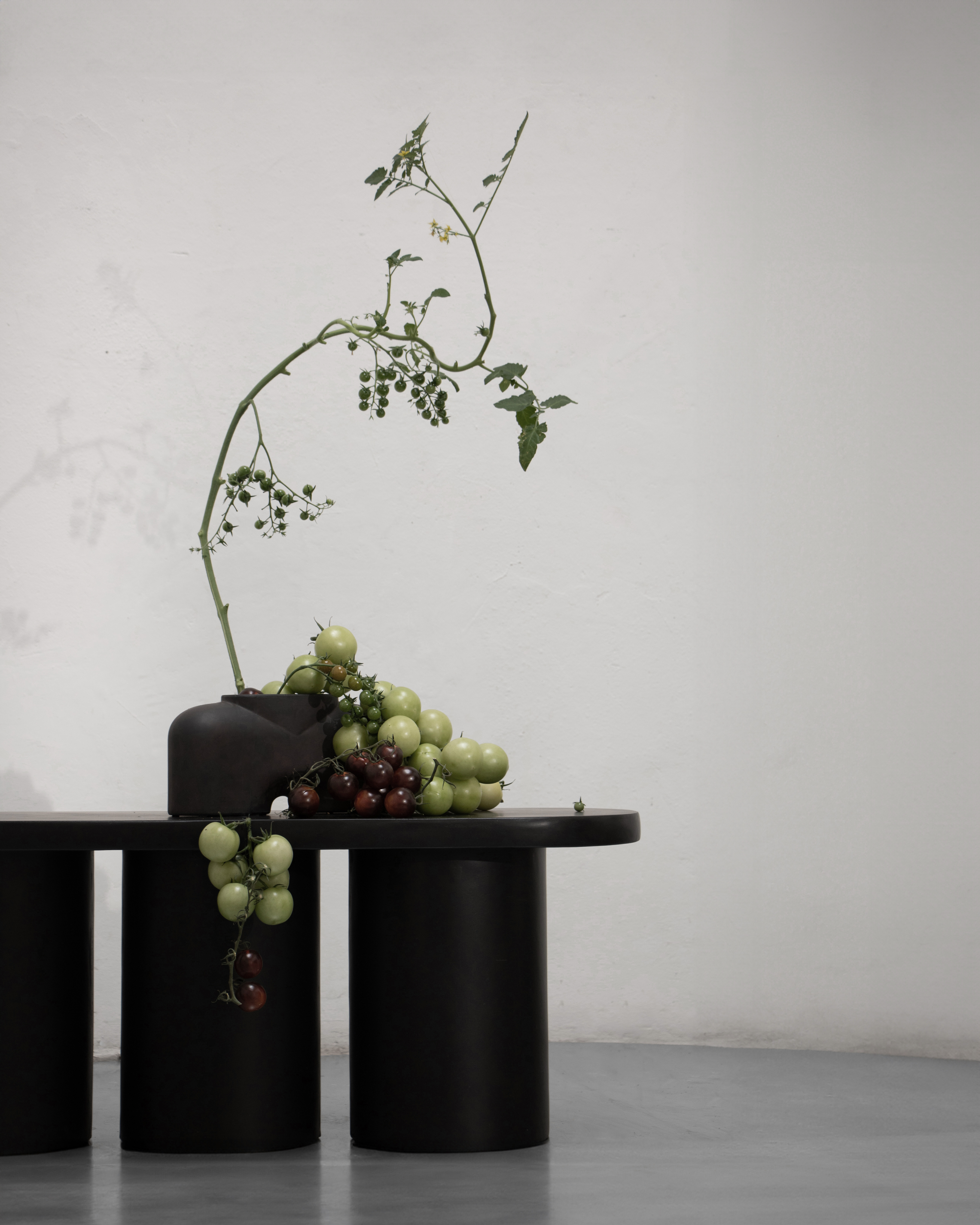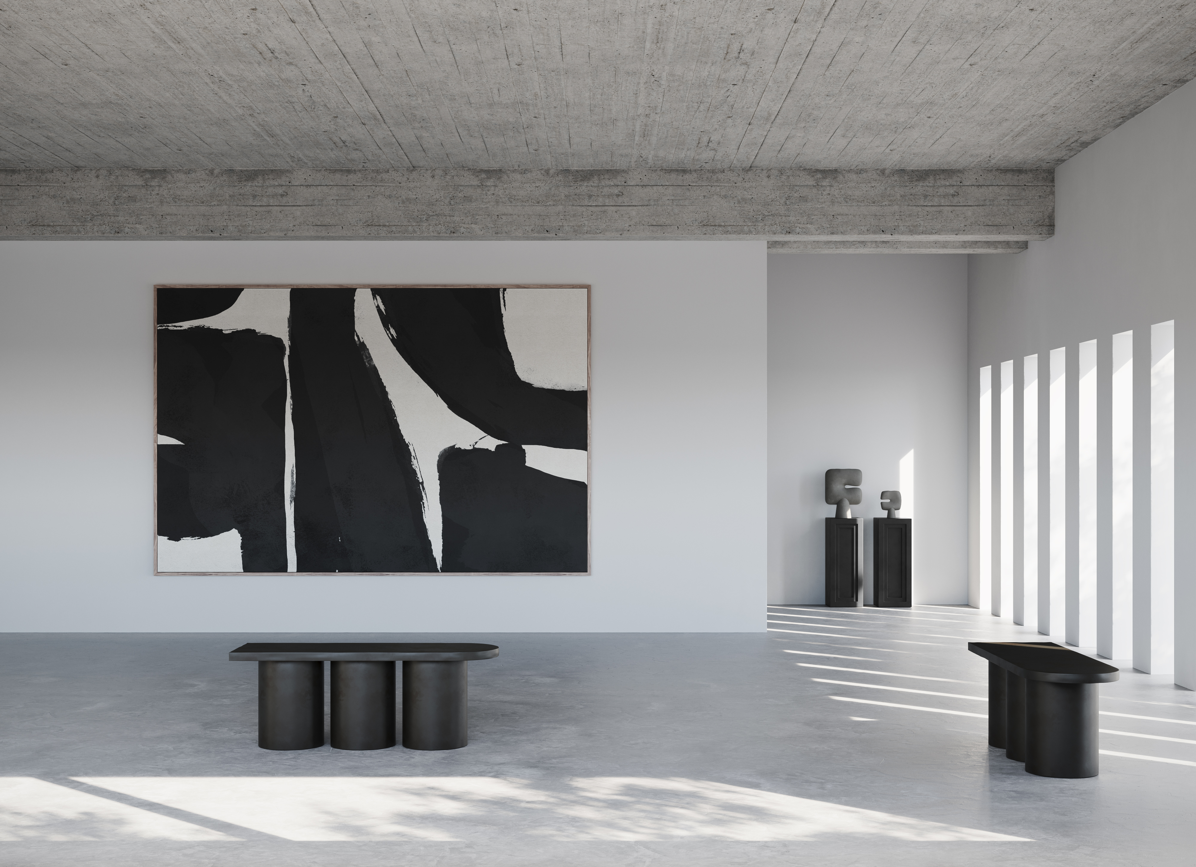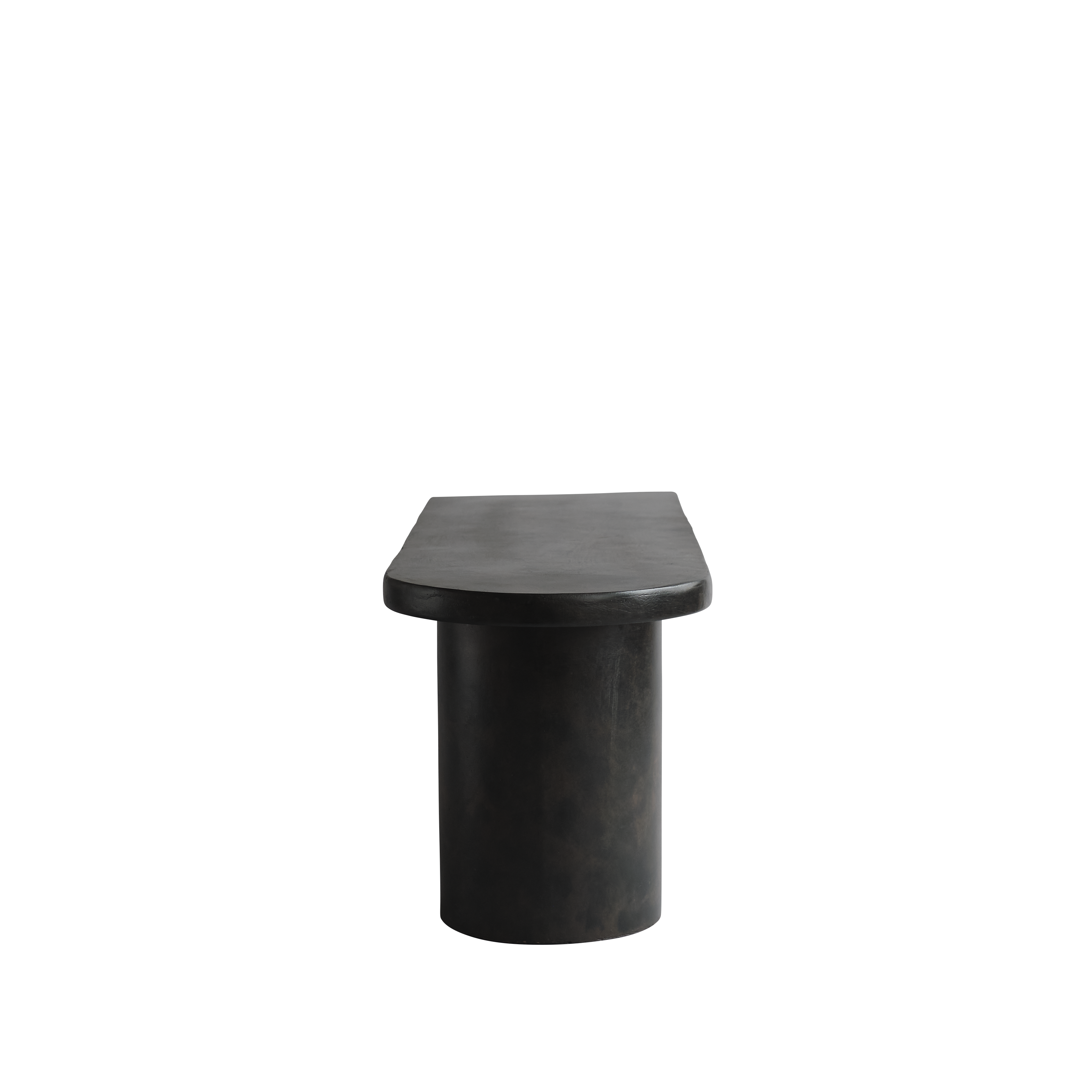 Drei zylindrische Beine tragen eine massive, leicht abgerundete Sitzfläche – ein Zusammenspiel aus Skulptur und Funktion, das sowohl in Wohnräumen als auch in Galerien, Boutiquen oder Lobbys ein markantes Statement setzt.
