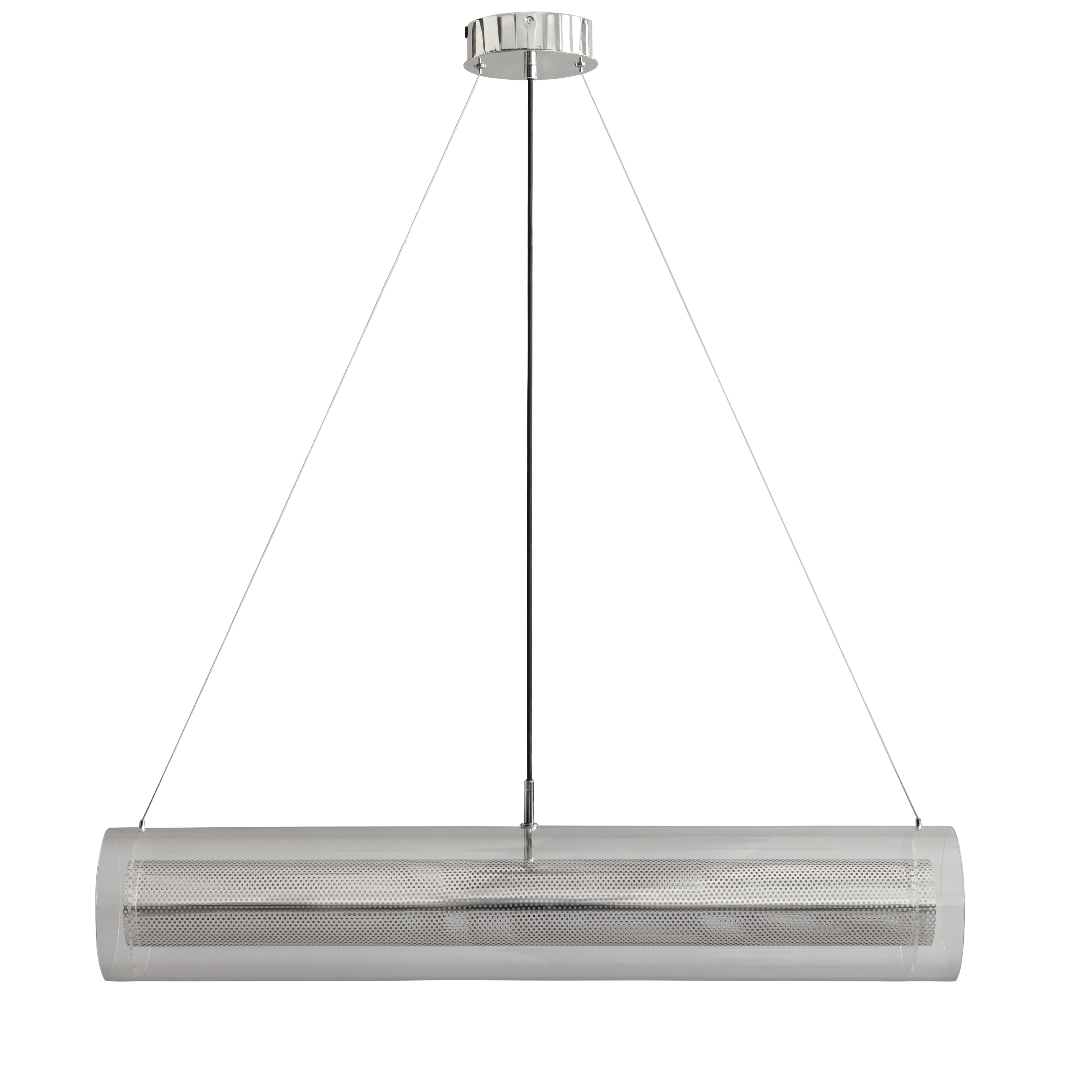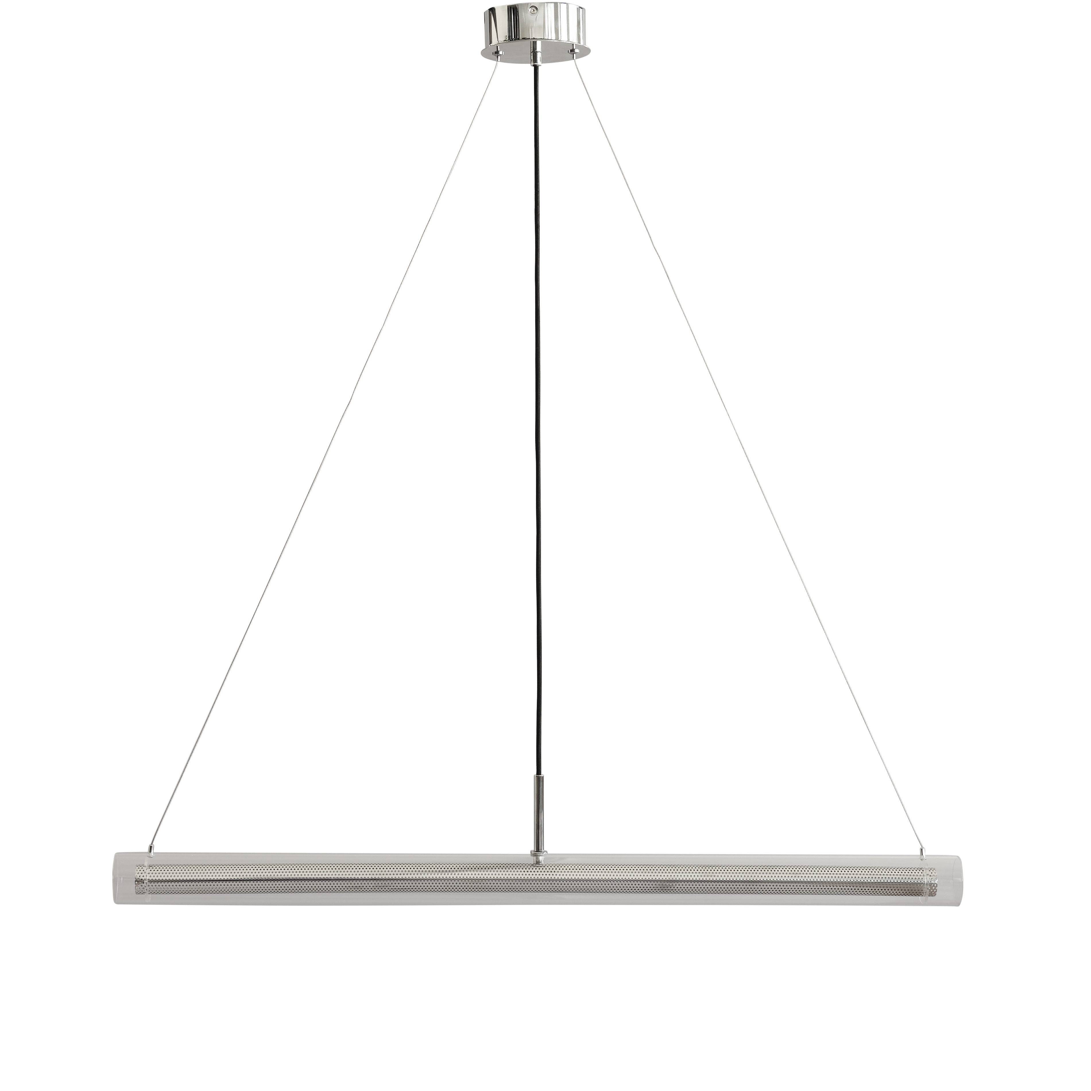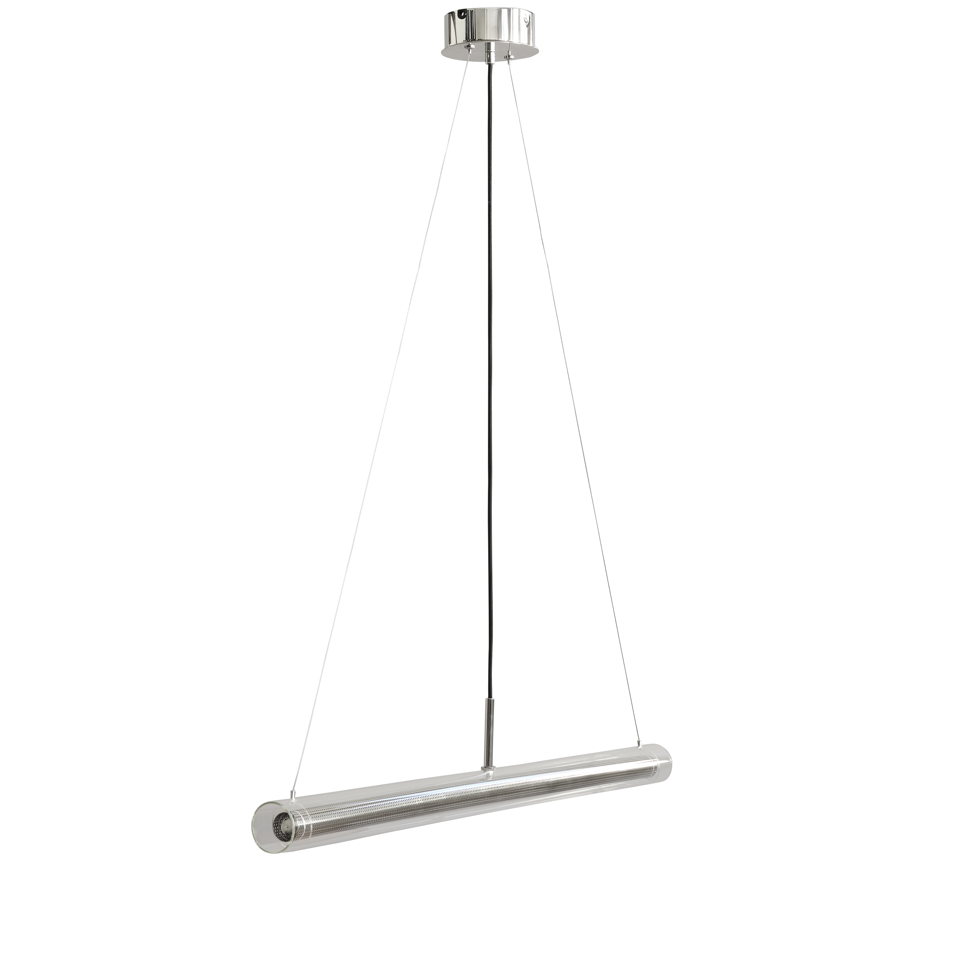Das filigrane Gestell aus verchromtem Metall und die weißen Acrylröhren mit Glasdiffusor erzeugen ein spannendes Wechselspiel von klaren Kanten und weichen Konturen. Die integrierte LED-Lichtquelle (2700 K, ca. 2059 Lumen, 7 W, 25 000 h Lebensdauer) strahlt blendfrei und behaglich und lässt sich über den eingebauten Touch-Dimmer steuern.