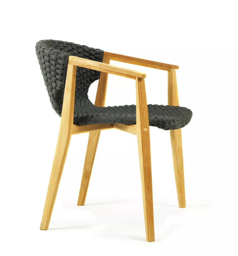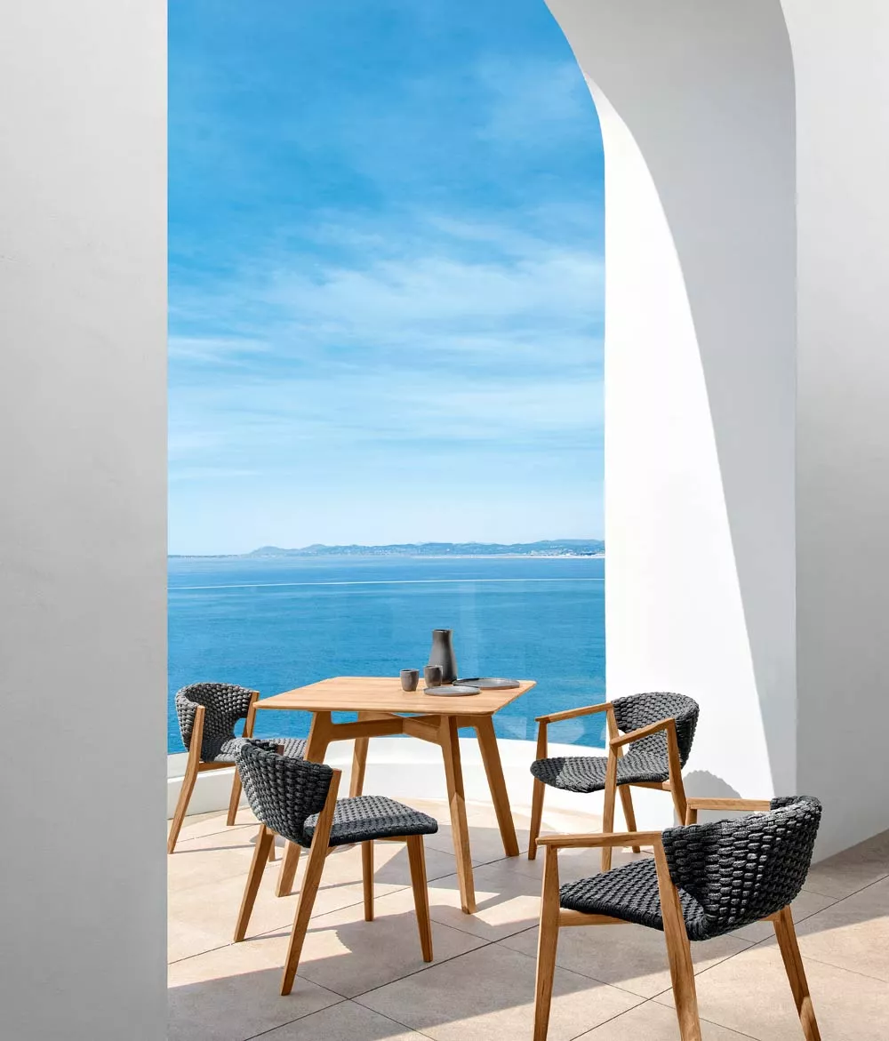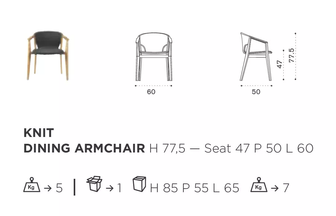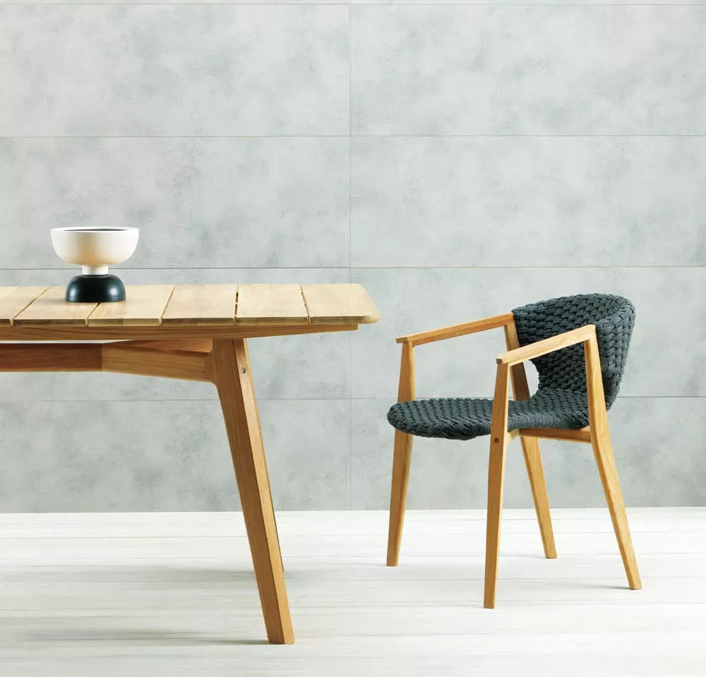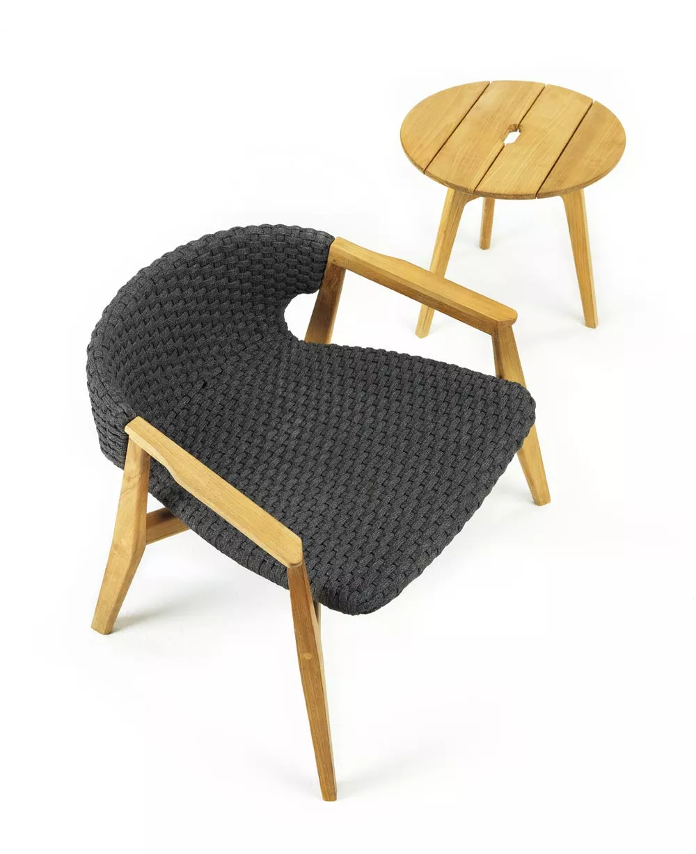 Die Kollektion Knit, erstmals vorgestellt auf der Mailänder Möbelmesse 2014, eröffnet die Zusammenarbeit zwischen Ethimo und Patrick Norguet, französischer Stardesigner, der mit modernen, puristischen Formen und stofflichen Empfindungen, einer besonderen Harmonie, Wärme und Schönheit nachspürt. Ethimo hat den Entwurf von Patrick Norguet, eine originelle Synthese aus Ästhetik und Funktion für das Leben im Freien, in Produkte verwandelt, die mit größter Sorgfalt in jedem Detail ausgeführt sind: vom Gestell der Tische und Stühle aus Teakholz bis zum synthetischen Flechtwerk des Lehnstuhls, auf elegante Weise ideal für Garten und Terrasse. Knit ist nicht nur raffiniert, sondern auch intelligent in jedem Detail; so der mittlere Schlitz im runden Tisch, der einen praktischen Griff für seinen Transport abgibt.