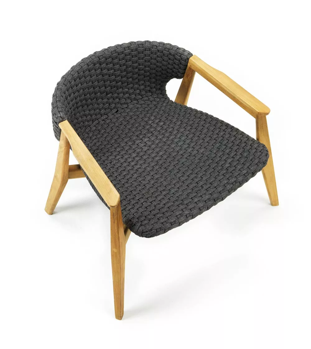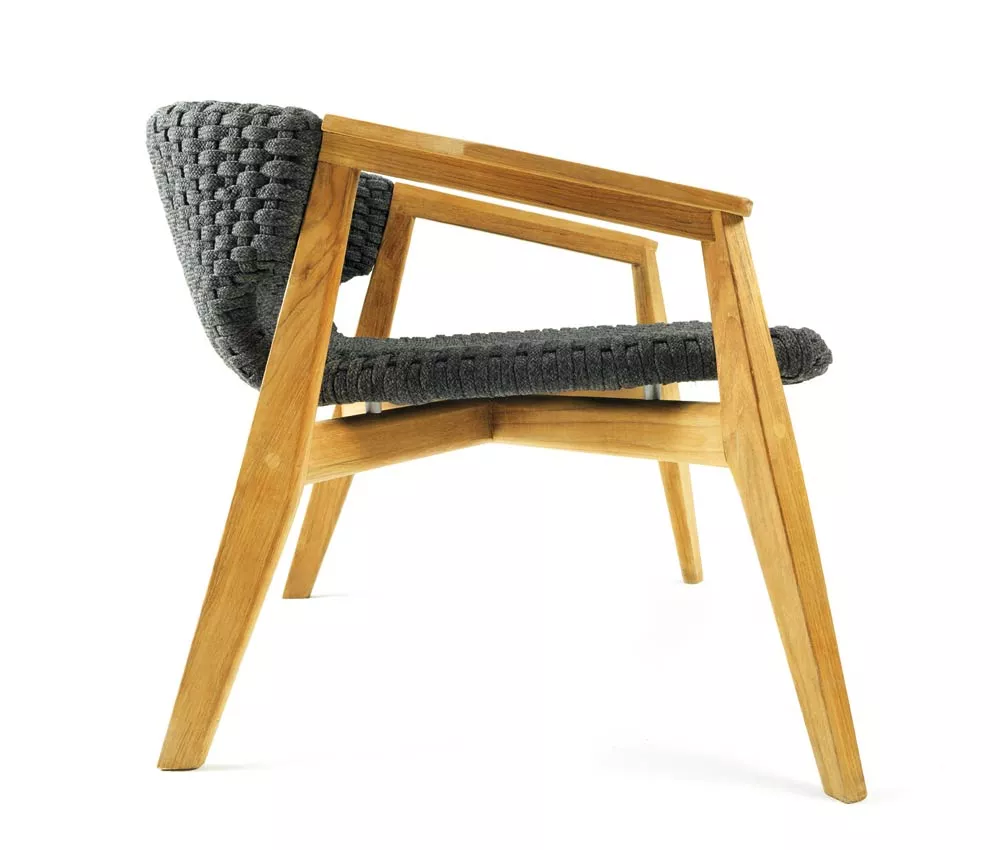 Ethimo Knit LoungesesselDie Kollektion Knit, erstmals vorgestellt auf der Mailänder Möbelmesse 2014, eröffnet die Zusammenarbeit zwischen Ethimo und Patrick Norguet, französischer Stardesigner, der mit modernen, puristischen Formen und stofflichen Empfindungen, einer besonderen Harmonie, Wärme und Schönheit nachspürt. Ethimo hat den Entwurf von Patrick Norguet, eine originelle Synthese aus Ästhetik und Funktion für das Leben im Freien, in Produkte verwandelt, die mit größter Sorgfalt in jedem Detail ausgeführt sind: vom Gestell der Tische und Stühle aus Teakholz bis zum synthetischen Flechtwerk des Lehnstuhls, auf elegante Weise ideal für Garten und Terrasse. Knit ist nicht nur raffiniert, sondern auch intelligent in jedem Detail; so der mittlere Schlitz im runden Tisch, der einen praktischen Griff für seinen Transport abgibt. Teakholz die Herstellung dieser hochwertigen Möbel erfolgt in erstklassiger Qualität UV-, witterungs- und farbbeständig leicht zu reinigen Maße: (B × T × H) 74 x 70 × 63 cmSitzhöhe: 35 cmGewicht: 9 kg