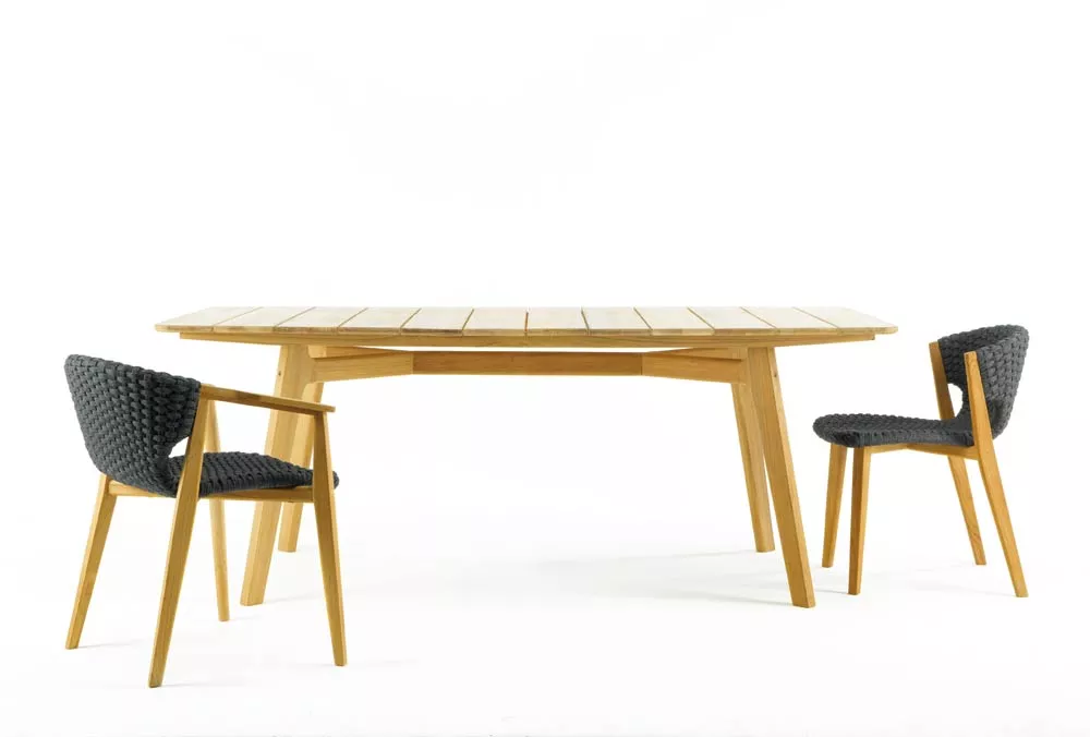 Ethimo Knit Esstisch | 200 × 100 cmDie Kollektion Knit, erstmals vorgestellt auf der Mailänder Möbelmesse 2014, eröffnet die Zusammenarbeit zwischen Ethimo und Patrick Norguet, französischer Stardesigner, der mit modernen, puristischen Formen und stofflichen Empfindungen, einer besonderen Harmonie, Wärme und Schönheit nachspürt. Ethimo hat den Entwurf von Patrick Norguet, eine originelle Synthese aus Ästhetik und Funktion für das Leben im Freien, in Produkte verwandelt, die mit größter Sorgfalt in jedem Detail ausgeführt sind: vom Gestell der Tische und Stühle aus Teakholz bis zum synthetischen Flechtwerk des Lehnstuhls, auf elegante Weise ideal für Garten und Terrasse. Knit ist nicht nur raffiniert, sondern auch intelligent in jedem Detail; so der mittlere Schlitz im runden Tisch, der einen praktischen Griff für seinen Transport abgibt. Teakholz die Herstellung dieser hochwertigen Möbel erfolgt in erstklassiger Qualität UV-, witterungs- und farbbeständig leicht zu reinigen Maße: (B × T × H) 200 x 100 x 76 cmGewicht: 70 kg
