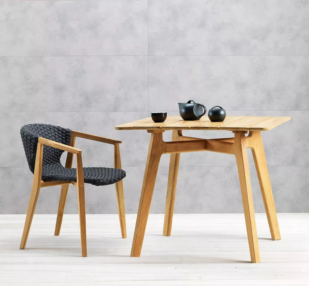 Ethimo Knit Esstisch | 90 x 90 cmDie Kollektion Knit, erstmals vorgestellt auf der Mailänder Möbelmesse 2014, eröffnet die Zusammenarbeit zwischen Ethimo und Patrick Norguet, französischer Stardesigner, der mit modernen, puristischen Formen und stofflichen Empfindungen, einer besonderen Harmonie, Wärme und Schönheit nachspürt. Ethimo hat den Entwurf von Patrick Norguet, eine originelle Synthese aus Ästhetik und Funktion für das Leben im Freien, in Produkte verwandelt, die mit größter Sorgfalt in jedem Detail ausgeführt sind: vom Gestell der Tische und Stühle aus Teakholz bis zum synthetischen Flechtwerk des Lehnstuhls, auf elegante Weise ideal für Garten und Terrasse. Knit ist nicht nur raffiniert, sondern auch intelligent in jedem Detail; so der mittlere Schlitz im runden Tisch, der einen praktischen Griff für seinen Transport abgibt. Teakholz die Herstellung dieser hochwertigen Möbel erfolgt in erstklassiger Qualität UV-, witterungs- und farbbeständig leicht zu reinigen Maße: (B × T × H) 90 x 90 x 76 cmGewicht: 17 kg