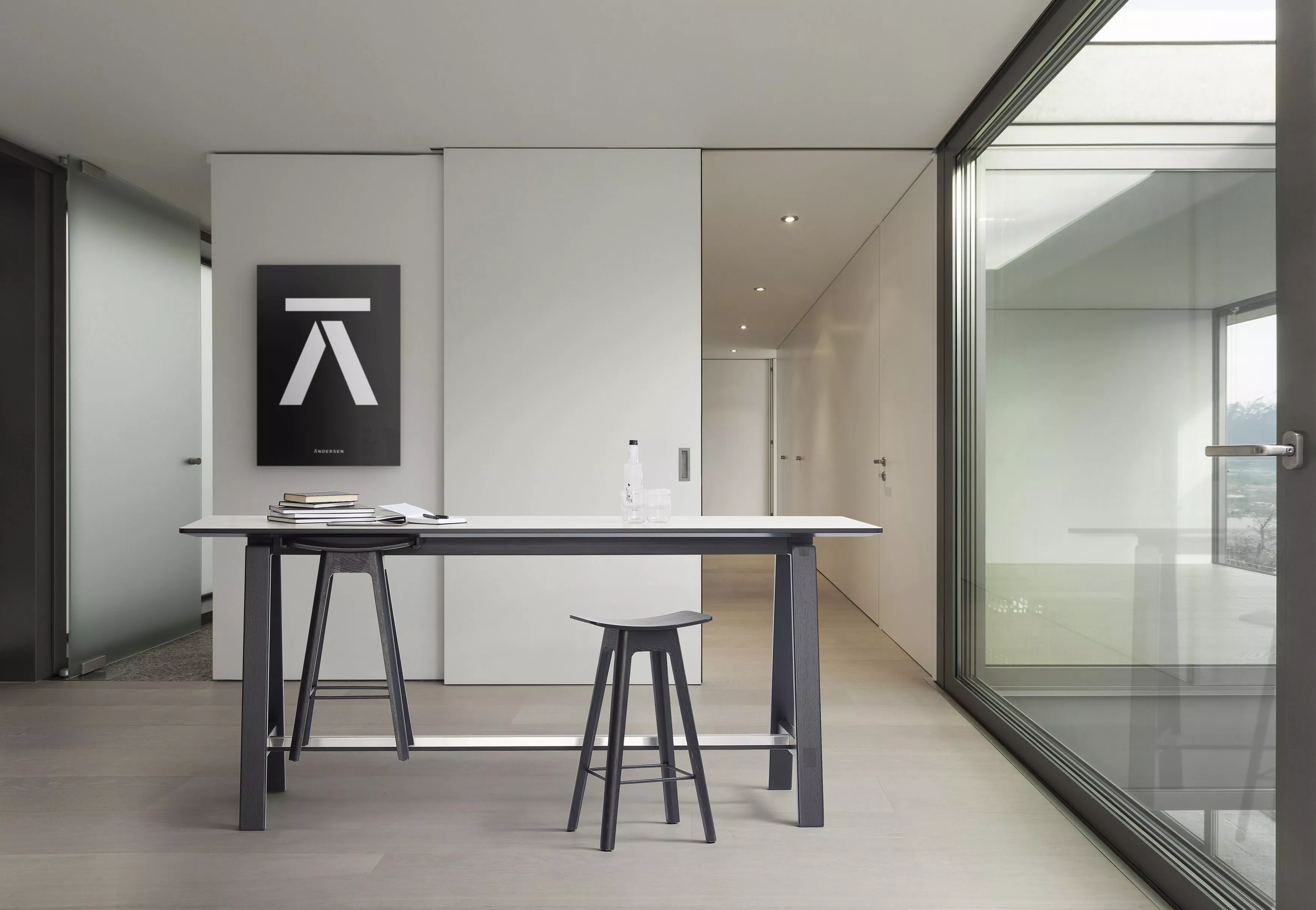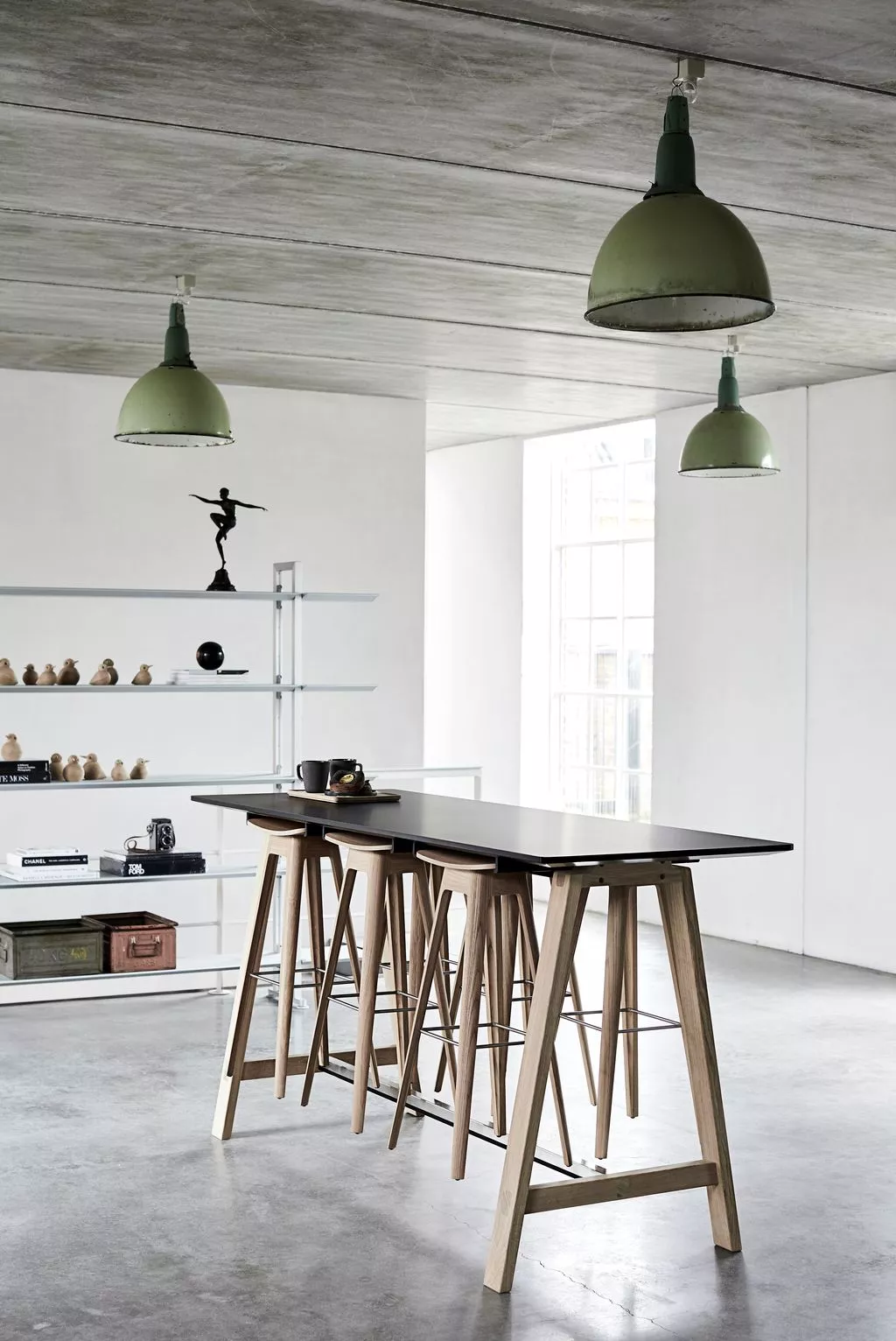 ANDERSEN HT1 Hochtisch Der HT1 Hochtisch von Andersen ist ein vielseitiger Tisch für Umgebungen wie Rezeptionen, Social Spaces und hochwertige Kantinen. Die Fußablage in Edelstahl gibt dem Tisch eine stylische Note und verbreitet klassischen Charme.HochtischTischplatte aus weißem LaminatBeine aus massiver Eiche (schwarz lackiert)Fußablage in EdelstahlDesigner: byKATOGewicht: 60 kgMaße:216 x 75 x 108 cm