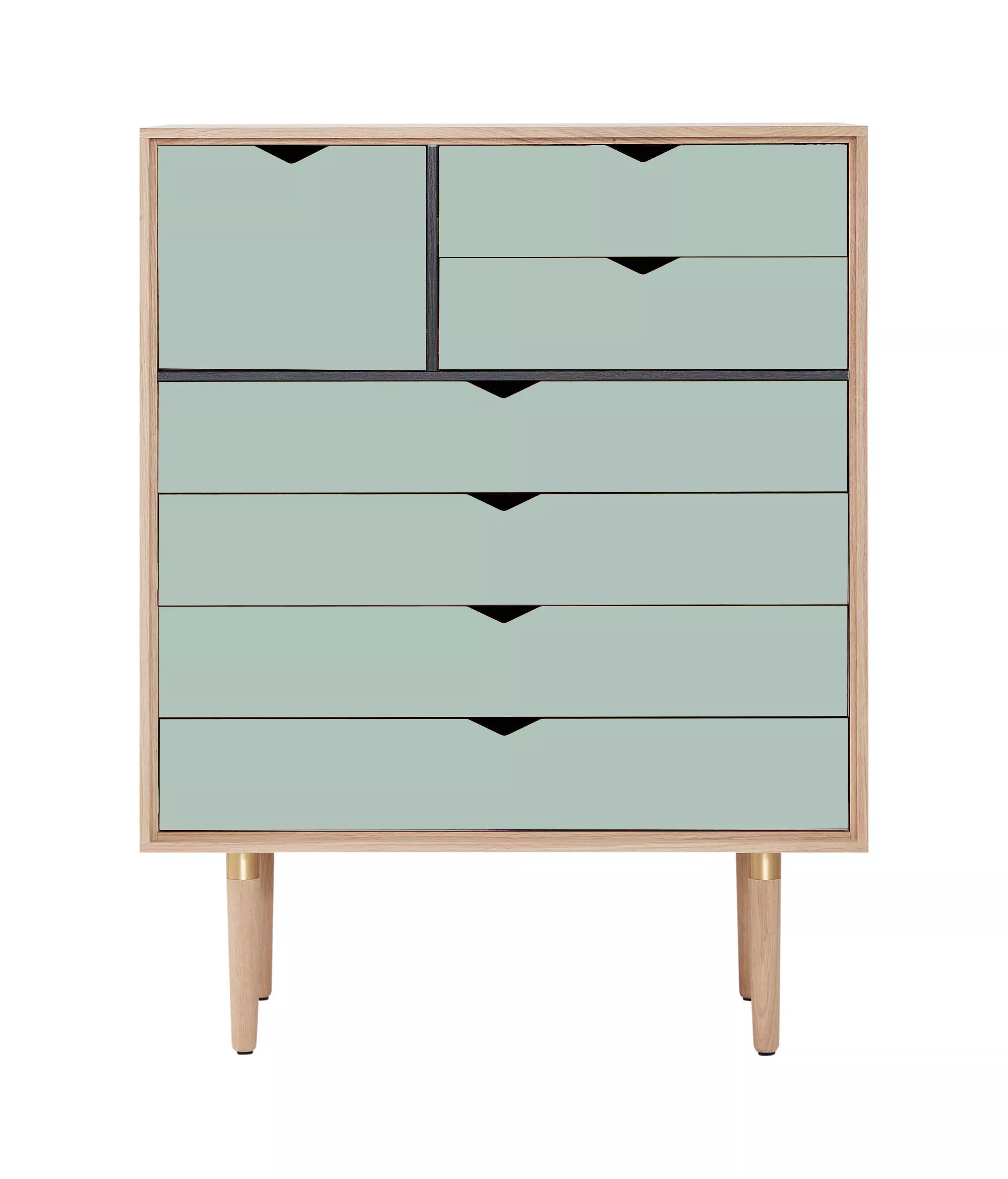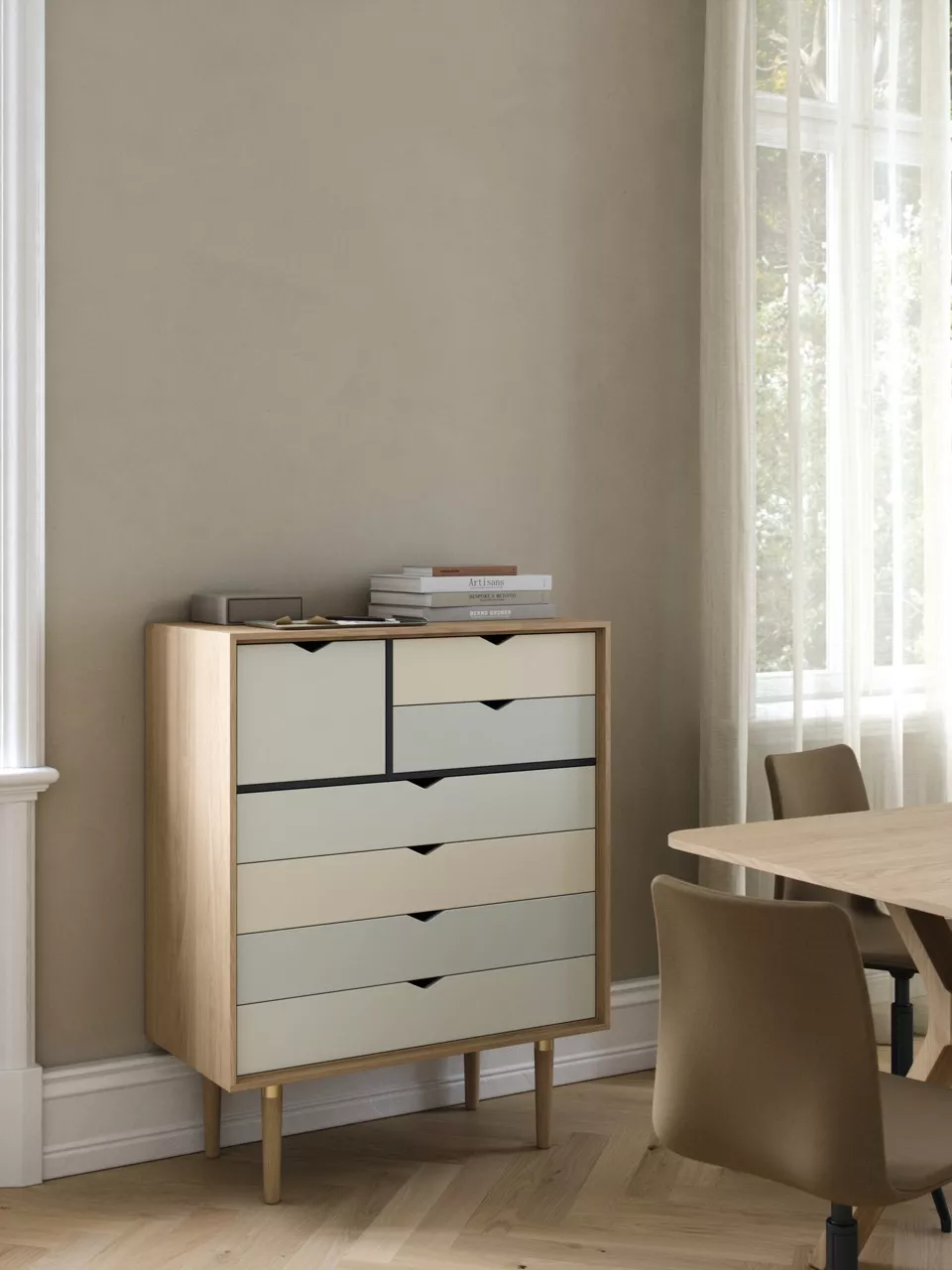 Die S8-Kommode von Andersen ist perfekt für Ihr Wohnzimmer, den Flur oder jeden anderen Raum, in dem Bedarf an Stauraum und stilvollem, auffälligem Design besteht. Der Korpus der Kommode ist in Eiche seifenbehandelt oder schwarz lackiert erhältlich, und Sie können zwischen einer klassischen weißen Front oder einer geschmackvollen Kombination in Beige- und Grautönen wählen. An den Beinen sind elegante Messingringe angebracht.
