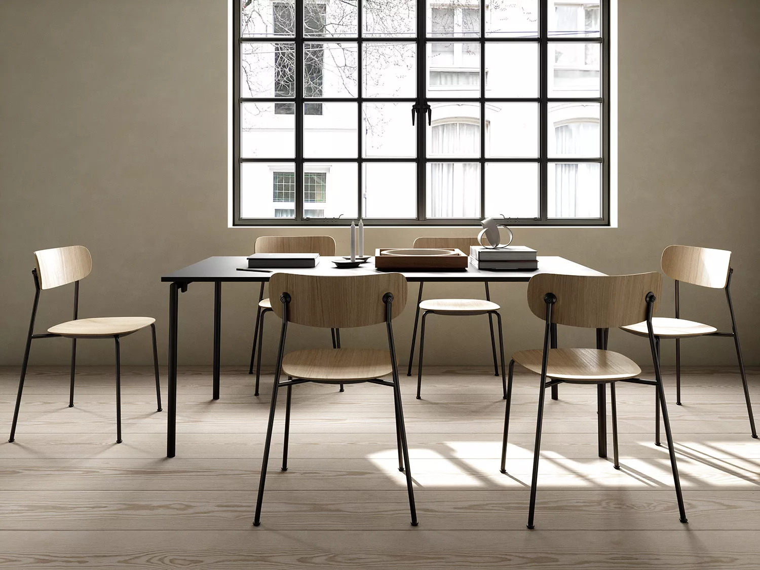 Der Scope-Stuhl bestehend aus einem eleganten schwarzen Gestell, einem schönen Rücken aus Eichenfurnier und einem bequemen Sitz aus schwarzem hochwertigem Leder. Entwickelt unter ökologischen Gesichtspunkten ist Scope eine Stuhlkollektion, die von Hans Thyge & Co. entworfen wurde. Scope ist FSC®-zertifiziert und ein ressourceneffizienter Stuhl, der mit einem gepolsterten Sitz aus schwarzem Leder konstruiert ist, damit der Stuhl extrem bequem ist und Sie den ganzen Abend lang am Esstisch sitzen können. Sein hölzerner Rücken und die einfache und schöne Konstruktion zusammen mit dem schwarzen Ledersitz ermöglichen es Ihnen, die Natur drinnen zu genießen und Ihrem Interieur eine warme und gemütliche Atmosphäre zu verleihen. Mit dem Scope-Stuhl erhalten Sie einen sehr bequemen Esszimmerstuhl, in dem Sie den ganzen Abend sitzen und ein köstliches Abendessen oder eine Nacht mit Freunden genießen können.