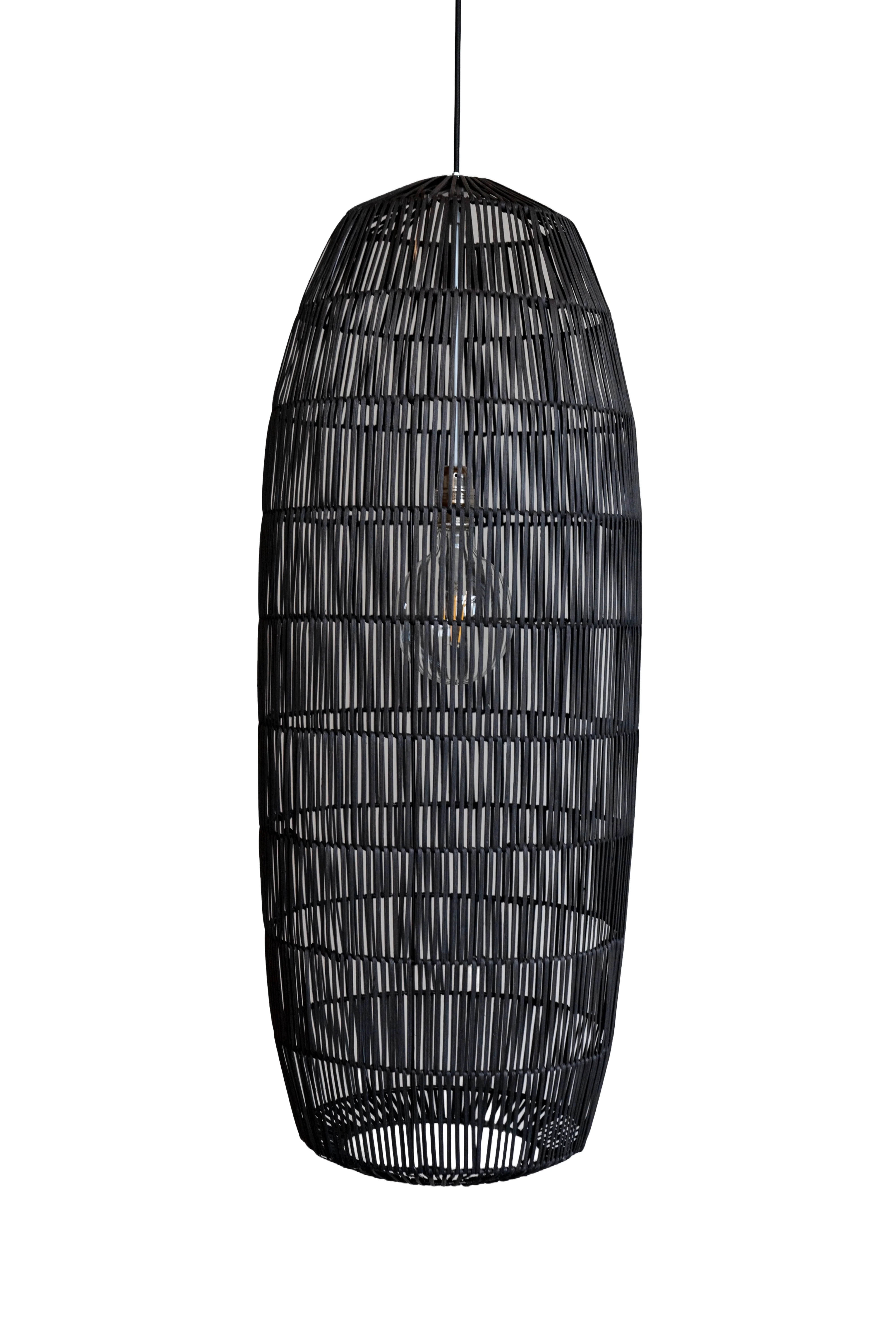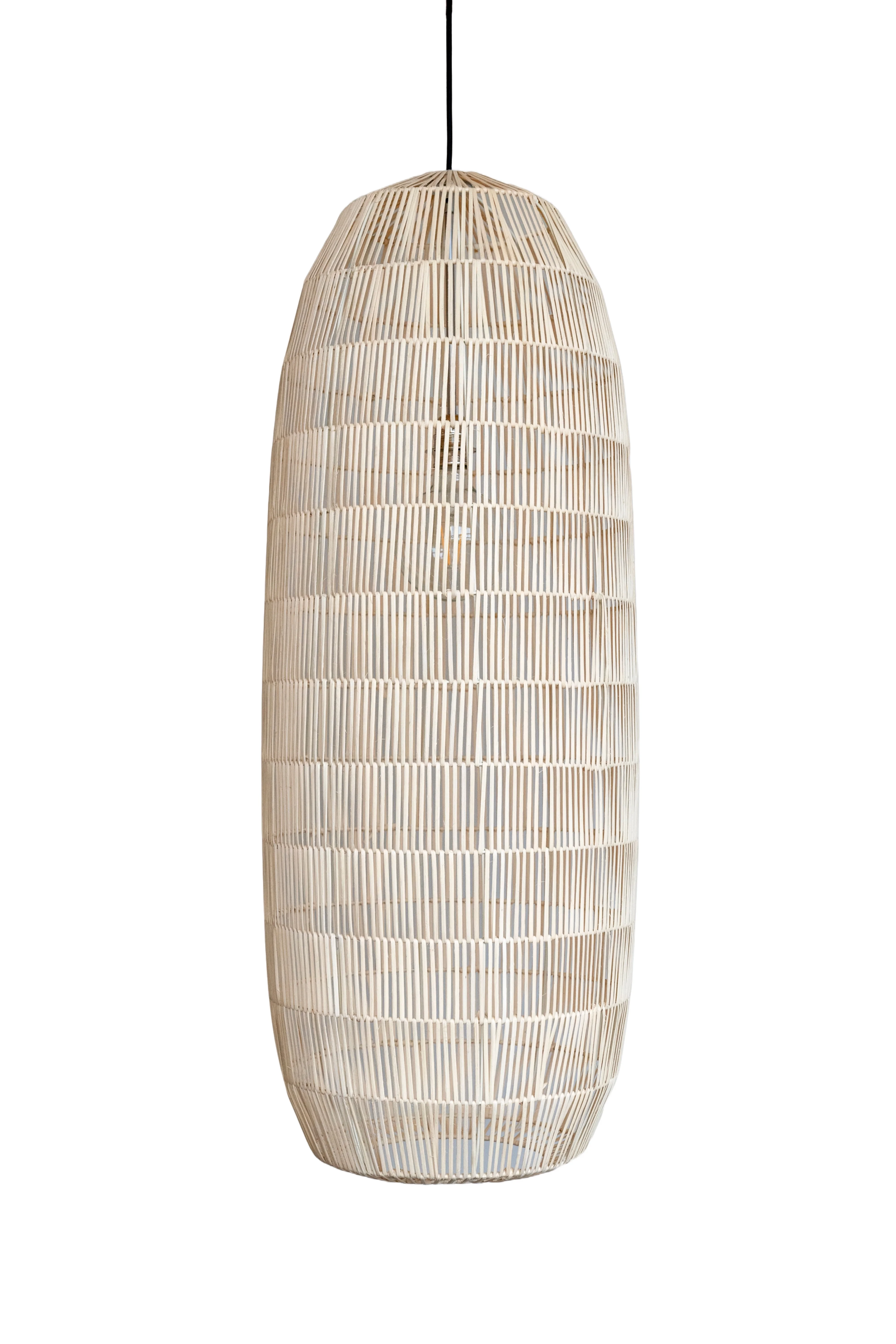 Ay illuminate CAP • Deckenleuchte Die Deckenleuchte Ay Illuminate CAP ist ein elegantes und organisches Designstück, das handwerkliche Tradition mit modernem Minimalismus verbindet. Sie besteht aus geflochtenem Bambus und schafft eine warme, natürliche Atmosphäre. Der Bambus ist in einem feinen Muster verarbeitet, das das Licht subtil filtert und sanfte Schattenspiele im Raum erzeugt. Varianten Die Leuchte CAP ist in zwei Größen erhältlich: CAP Small: Mit einem Durchmesser von 38 cm und einer Höhe von 92 cm eignet sich diese Variante besonders für kleinere Räume oder als elegantes Designelement über Esstischen, Arbeitsflächen oder in gemütlichen Sitzecken. CAP Large: Diese größere Version mit einem Durchmesser von 48 cm und einer Höhe von 112 cm ist ideal für größere Räume oder als Blickfang in hohen Räumen. Sie verleiht jedem Raum eine eindrucksvolle visuelle Präsenz. Materialien: geflochtener Bambus (natur)Fassung für E27, max 60WMit einem schwarzen 3-Meter Kabel ausgestattetHergestellt aus natürlichen Materialien, ohne chemische Behandlung, d.h. Farben können durch Sonneneinstrahlung verblassen oder sich ändern exkl. Lichtquelle (optional auswählbar) Maße:CAP SMALL: ø 38 x 92 cm (BxH) Gewicht: 0,5 kg CAP LARGE: ø 48 x 112 cm (BxH) Gewicht: 0,6 kg