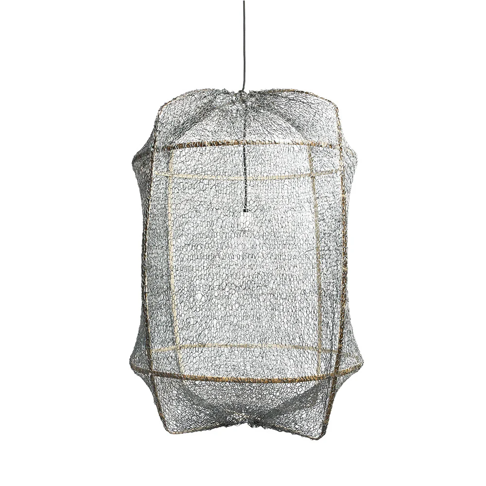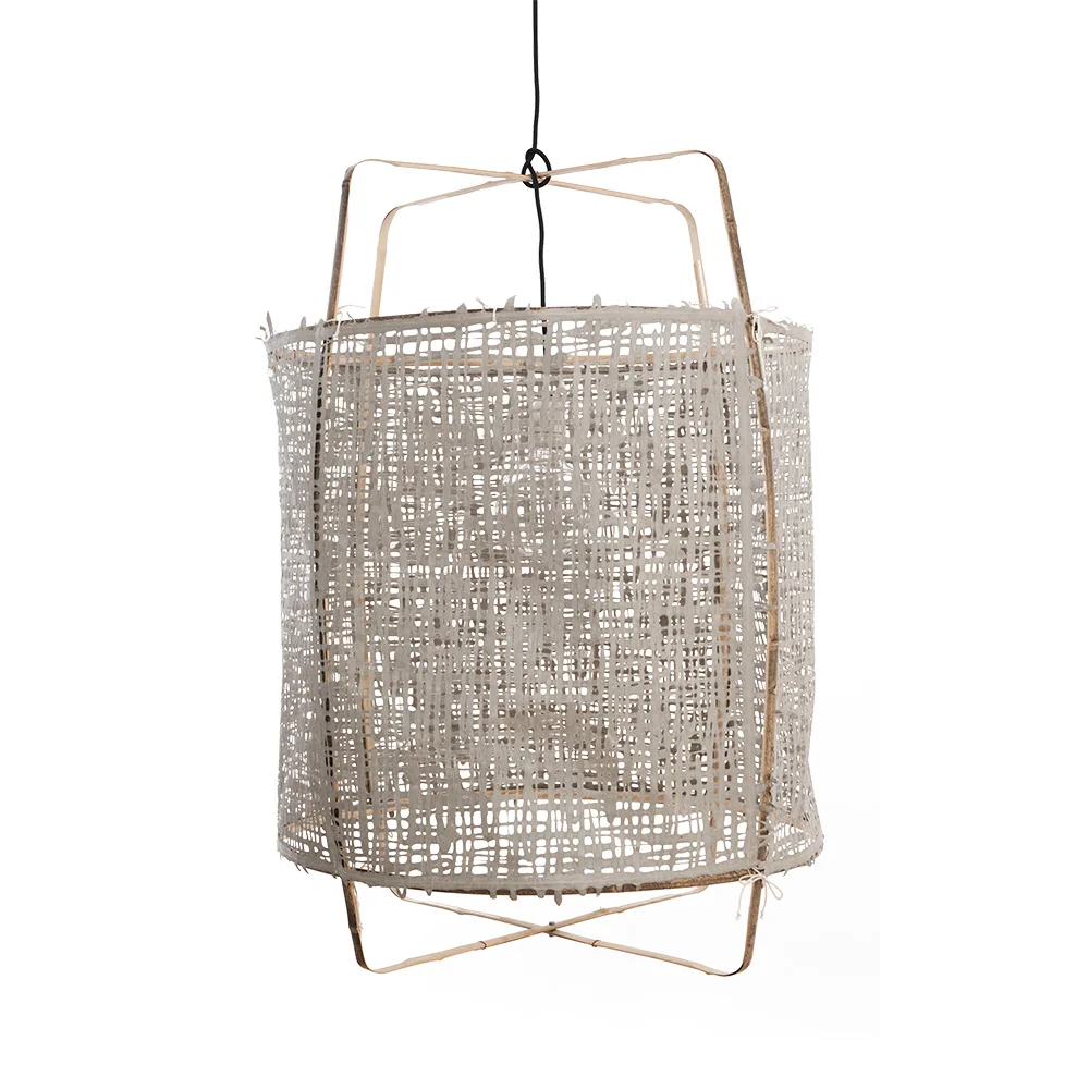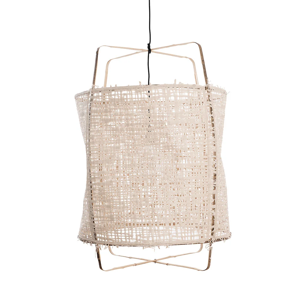 Ay illuminate Z2 • Deckenleuchte Die Deckenleuchte Z2 von Ay Illuminate verkörpert ikonisches Design und besticht durch die Kombination von handwerklichem Können und natürlichen Materialien. Mit ihrem schlichten, modernen Look und der Verwendung von Naturfasern verleiht sie jedem Raum eine besondere Atmosphäre. Das Gestell der Z2 besteht aus hellem Bambus, einer helleren Variante des Materials, das von Hand zu einer eleganten, filigranen Struktur geformt wird. Die natürliche, leicht goldene Farbe des Bambus verleiht der Leuchte einen sanften, warmen Ton, der perfekt in helle, luftige Räume passt. Der Bambus bildet die Basis, die durch verschiedene Schirme ergänzt wird. Je nach Ausführung variieren die Materialien und Texturen, um das Licht weich und stimmungsvoll im Raum zu verteilen. Die Z2 Deckenlampe ist in folgenden Konfigurationen erhältlich: Baumwolle + Bambus: Ein Schirm aus weicher Baumwolle, der das Licht warm und gleichmäßig verteilt. Papier + Bambus: Papier als Schirmmaterial verleiht der Leuchte einen leichten und natürlichen Charakter mit einer dezenten, diffusen Lichtwirkung. Bambus + Seide + Kashmir: Eine luxuriöse Kombination aus Bambusgestell und edlen Stoffen wie Seide und Kaschmir, die der Leuchte einen Hauch von Raffinesse verleiht. Bambus + Seide: Seide sorgt für eine feine, sanfte Lichtstreuung und verleiht der Leuchte eine elegante Anmutung. Bambus + Sisal: Sisal, eine robuste Naturfaser, bietet eine etwas gröbere, strukturierte Oberfläche und sorgt für einen rustikalen, aber dennoch stilvollen Look. Diese Variante ist komplett über das Bambusgestell gespannt.Fassung für E27, max 60WMit einem schwarzen 3-Meter Kabel ausgestattetHergestellt aus natürlichen Materialien, ohne chemische Behandlung, d.h. Farben können durch Sonneneinstrahlung verblassen oder sich ändernPendant aus Porzellan exkl. Lichtquelle (optional auswählbar) Maße:ø 67 x 96 cm (BxH) Gewicht Rahmen: 0,5 kg