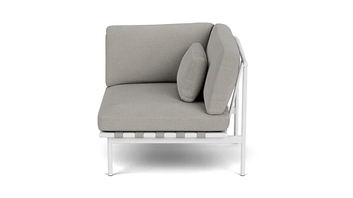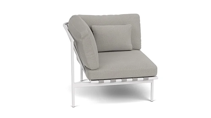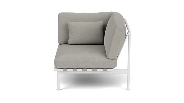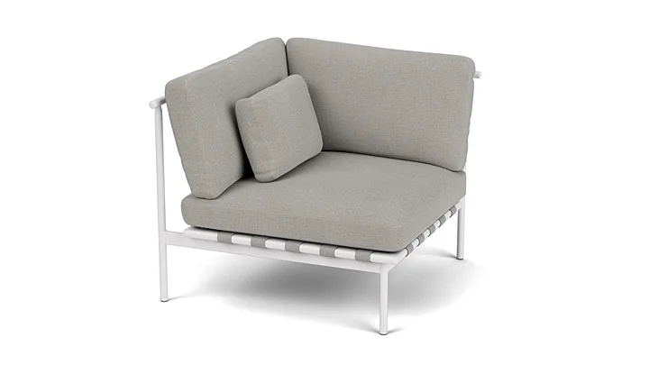 Gefertigt aus einem hochwertigen, pulverbeschichteten Aluminiumrahmen, bietet das Eckmodul eine langlebige, wetterbeständige Konstruktion und ist in den Farbvarianten Arctic White und Forge Grey erhältlich. Die luxuriösen, gut verarbeiteten Kissen bieten höchsten Sitzkomfort und fügen sich harmonisch in das durchdachte Design ein.