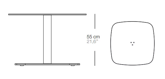 Mit anderen Worten, es handelt sich um eine Zwischenform zwischen einem Quadrat und einem Kreis. Dank dieser Geometrie kann die Kollektion quadratische und runde Tischplatten aus verschiedenen Materialien kombinieren.