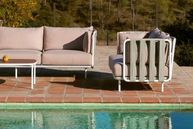 Teja entstand aus der Beobachtung unterschiedlicher Texturen, die wir in der mediterranen Landschaft finden können. Holz, Seil und Metall sind normalerweise in diesen Räumen vorhanden, Materialien, die auch in dieser Kollektion als Inspiration dienen, ebenso wie die überlappenden Ebenen ihrer Dächer, die die Terrassen dieser geografischen Region charakterisieren.