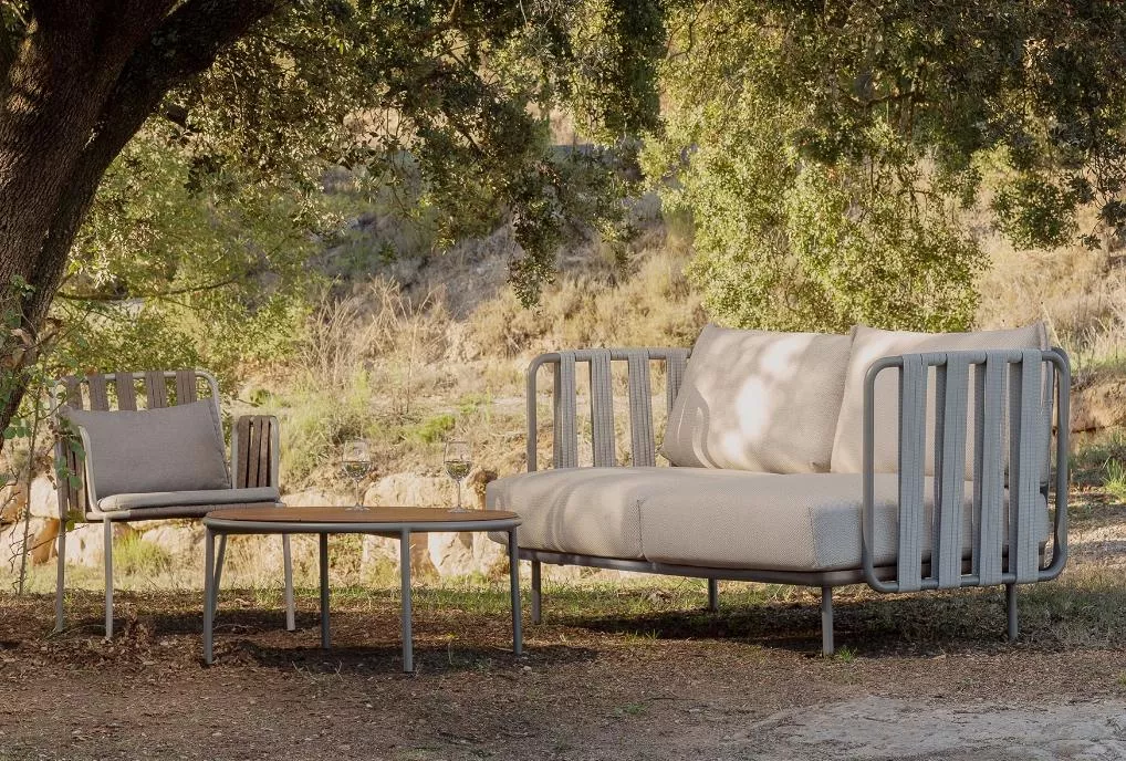 Teja entstand aus der Beobachtung unterschiedlicher Texturen, die wir in der mediterranen Landschaft finden können. Holz, Seil und Metall sind normalerweise in diesen Räumen vorhanden, Materialien, die auch in dieser Kollektion als Inspiration dienen, ebenso wie die überlappenden Ebenen ihrer Dächer, die die Terrassen dieser geografischen Region charakterisieren.