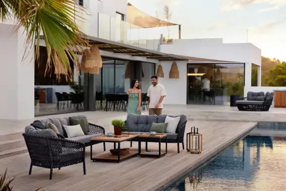 Das Sofa verfügt über komfortable und besonders weiche Polster, die ihm eine sanfte Optik verleihen. Das QuickDry & Airflow-System ermöglicht eine Trocknungszeit der Polster von nur einer Stunde nach einem Regenschauer.