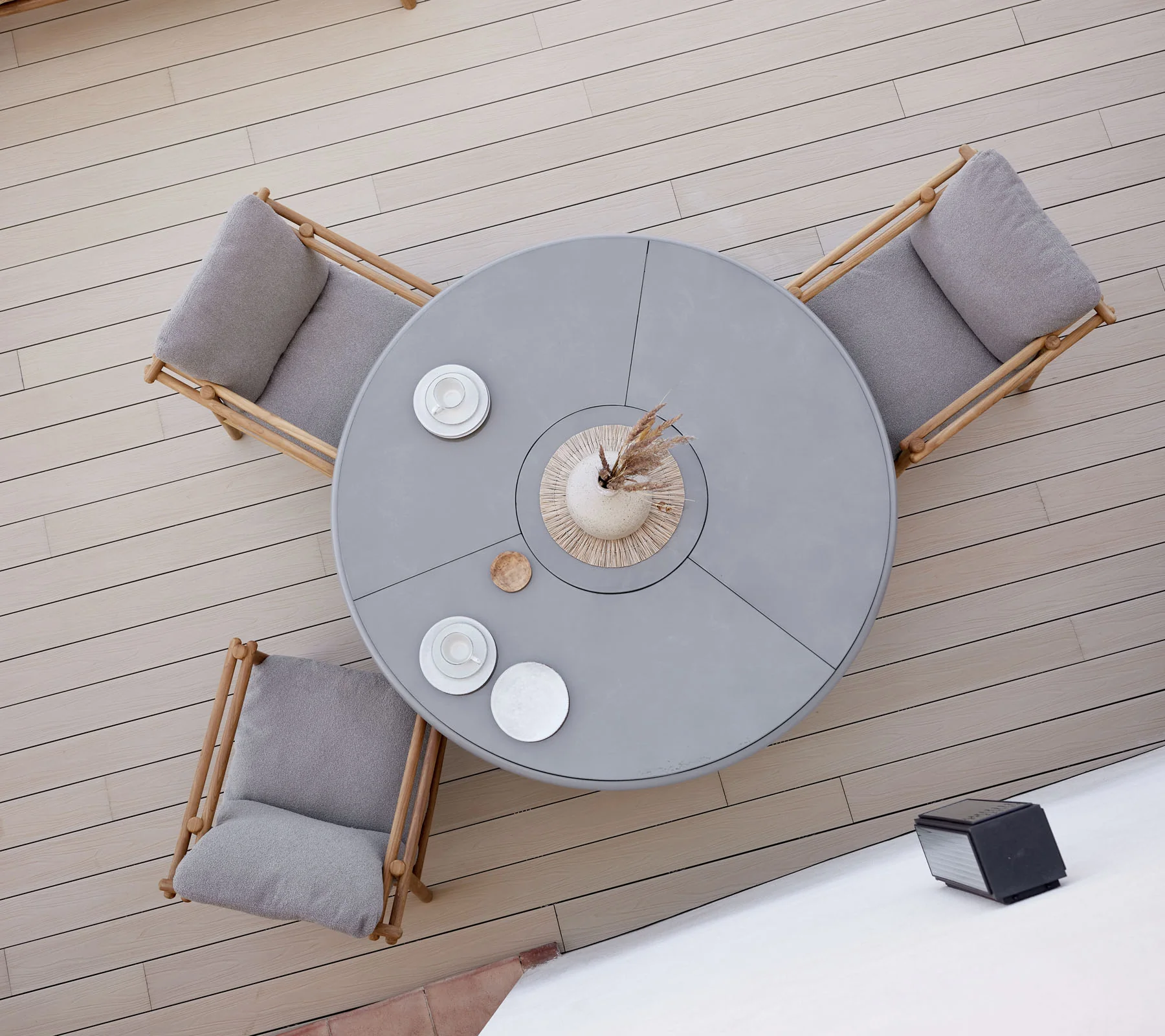 Cane-line GLAZE Couchtisch klein Glaze Couchtisch – Ein Hauch natürlicher Eleganz Der Glaze Couchtisch verbindet dekorative Leichtigkeit mit zeitloser Ästhetik und ist die ideale Ergänzung für Ihre Lounge oder eine gemütliche Leseecke im Freien. Mit seiner feinen Formsprache und den sorgfältig ausgewählten Materialien bringt er Stil und Persönlichkeit in jeden Außenbereich. Gestalten Sie Ihre Terrasse oder Garten ganz individuell, indem Sie Glaze-Tische in verschiedenen Größen, Farben und Materialien kombinieren. So entsteht ein lebendiger, verspielter Look mit ganz eigenem Charakter – von modern-minimalistisch bis natürlich-warm. Besonders faszinierend ist die Variante mit einer glasierten Lavasteinplatte, die durch ihre Entstehung ein echtes Stück Naturgeschichte erzählt. Lavastein ist ein Naturmaterial, das beim Erstarren heißer Lava entsteht und im Verlauf dieses natürlichen Prozesses verschiedene Elemente aufnehmen kann. So entstehen beim Brennvorgang bei rund 950 °C gelegentlich grüne Einschlüsse, die aus eingeschlossenen Eisenpartikeln stammen. Diese machen jeden Tisch einzigartig und stellen keinen Mangel dar – sie sind vielmehr Ausdruck der Ursprünglichkeit des Materials. Alternativ ist der Glaze Couchtisch auch mit einer 60 cm langen Teakholzplatte erhältlich, die mit ihrer warmen Ausstrahlung ein harmonisches Gegengewicht zu den glasierten Oberflächen bildet. Ob als stilvoller Solist oder im Set – der Glaze Couchtisch verleiht Ihrem Außenbereich eine besondere Note, die Natürlichkeit und Design harmonisch vereint. ProdukteingenschaftenGestell: Aluminium Semi Glossy - verschiedene FarbenSowohl im Innen- als auch im Außenbereich einsetzbarWartungsarm und pflegeleichtMaße: 45 cm (Aluminium, Lavastein) bzw. 60 cm (Teak) Durchmesser; Höhe: 45 cm
