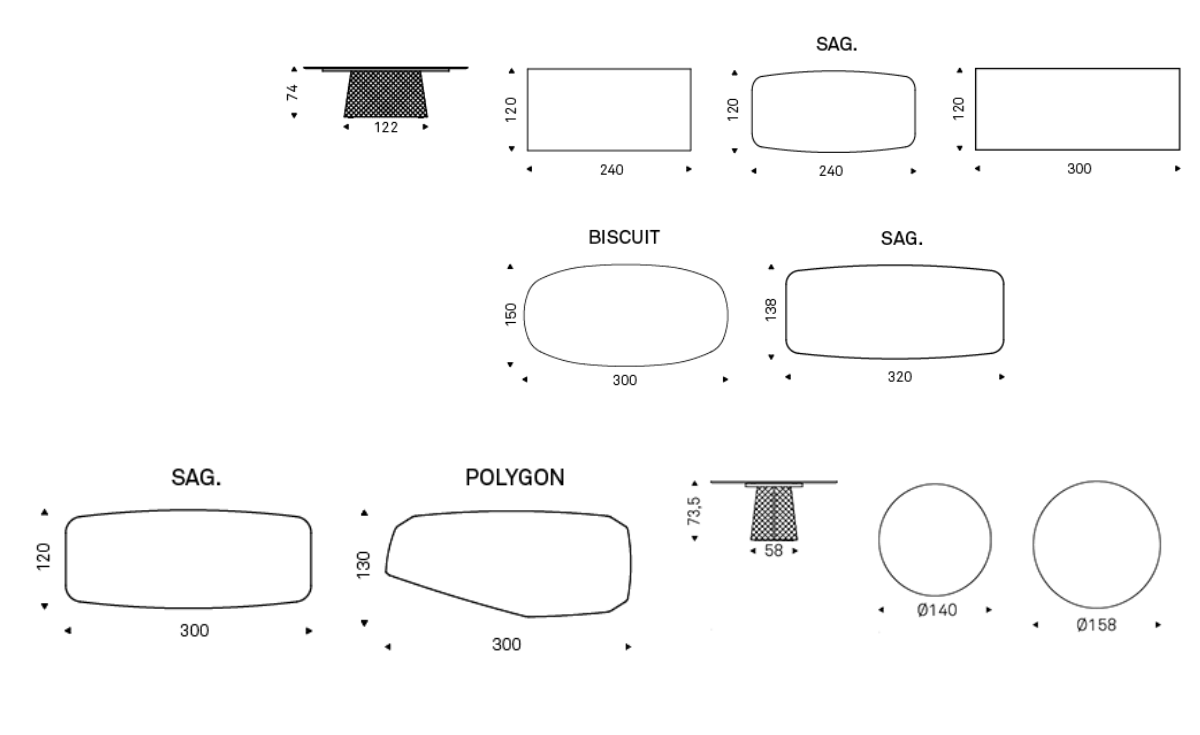 Je nach Ausführung zeigt sich der ATLANTIS in fünf Formen: rund, rechteckig, rechteckig geformt, polygon und biscuit. Der Tisch ist insgesamt in 9 verschiedenen Größen erhältlich.