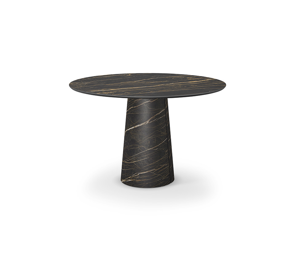 Erstmals wurde bei diesem Modell das widerstandsfähige Material Keramik so geformt, dass es sowohl für die runde Tischplatte als auch für den zylindrischen Sockel eingesetzt werden kann. Das Ergebnis ist ein harmonischer, monolithischer Look – als wäre der Tisch aus einem einzigen Stück edlen Steins gefertigt.