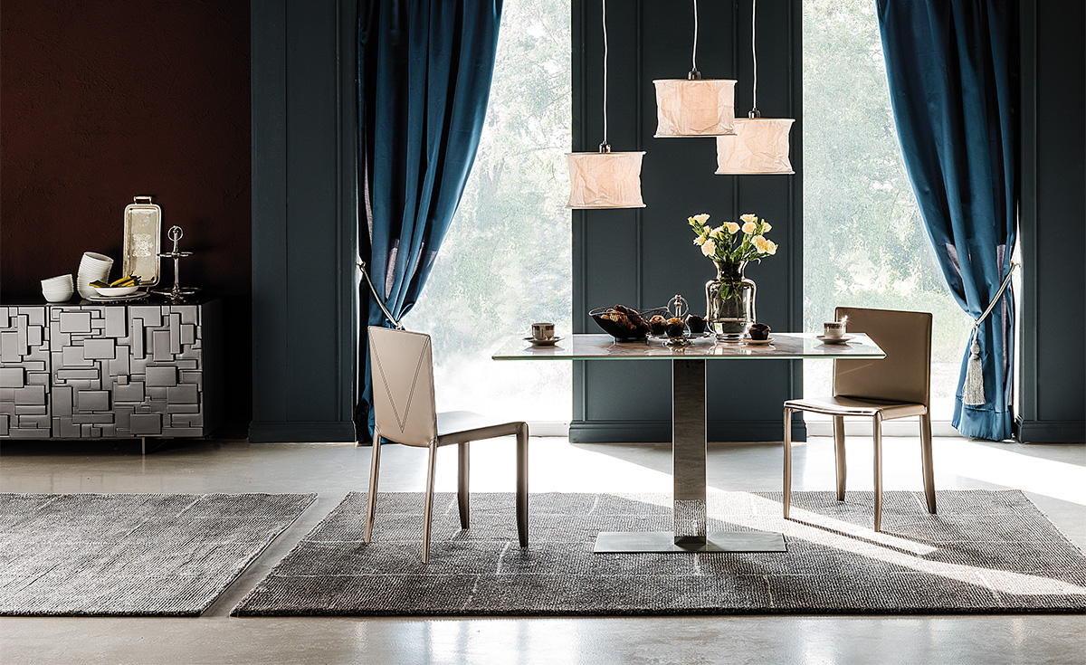 Seine elegante Basis besteht aus satiniertem Edelstahl und die Säule wahlweise aus glänzendem Edelstahl oder lackiertem Stahl in titan oder graphit. Die transparente 15 mm Tischplatte liegt frei auf und lässt das skulpturale Untergestell zur Geltung kommen.