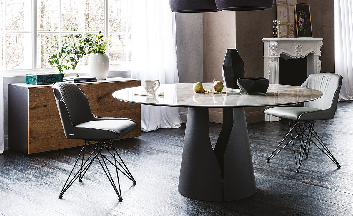 Beim Giano Keramik verschmilzt die präzise Linienführung der Stahlbasis mit der luxuriösen Oberfläche einer Keramik-Marmor-Platte zu einem eleganten Gesamtkunstwerk.