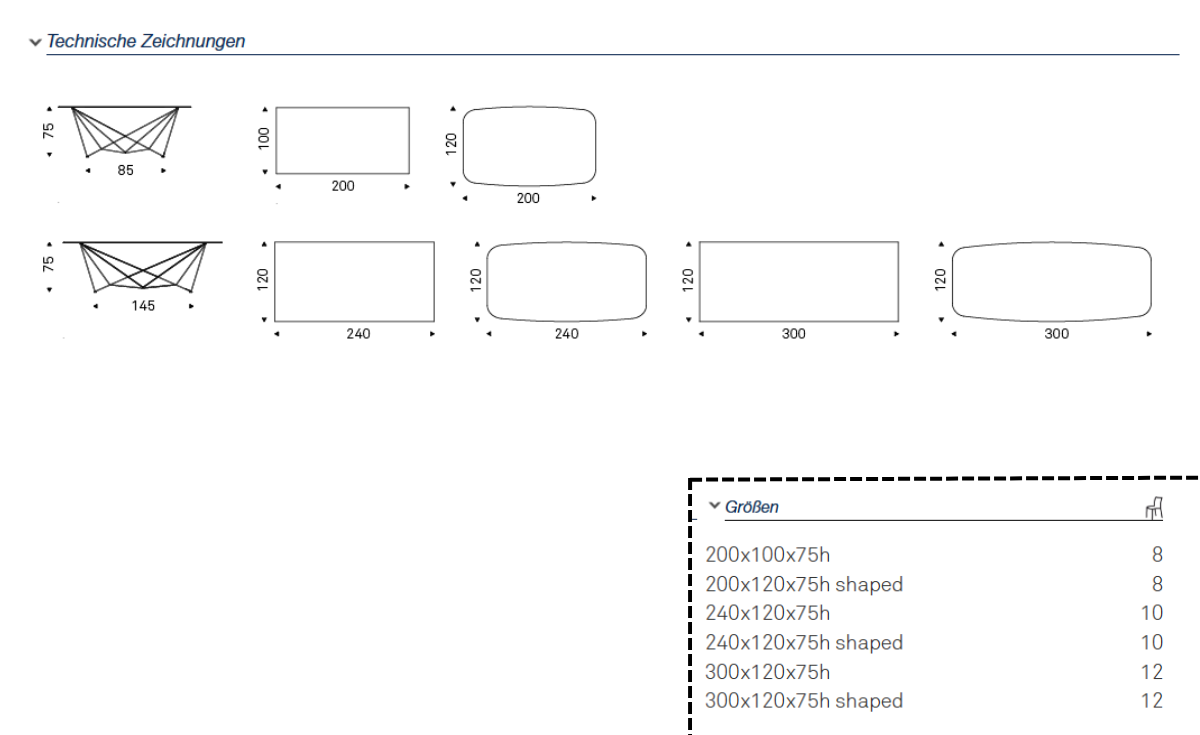 | Tischgröße: | 200 x 100 cm, 200 x 120 cm, 240 x 120 cm Geformt |