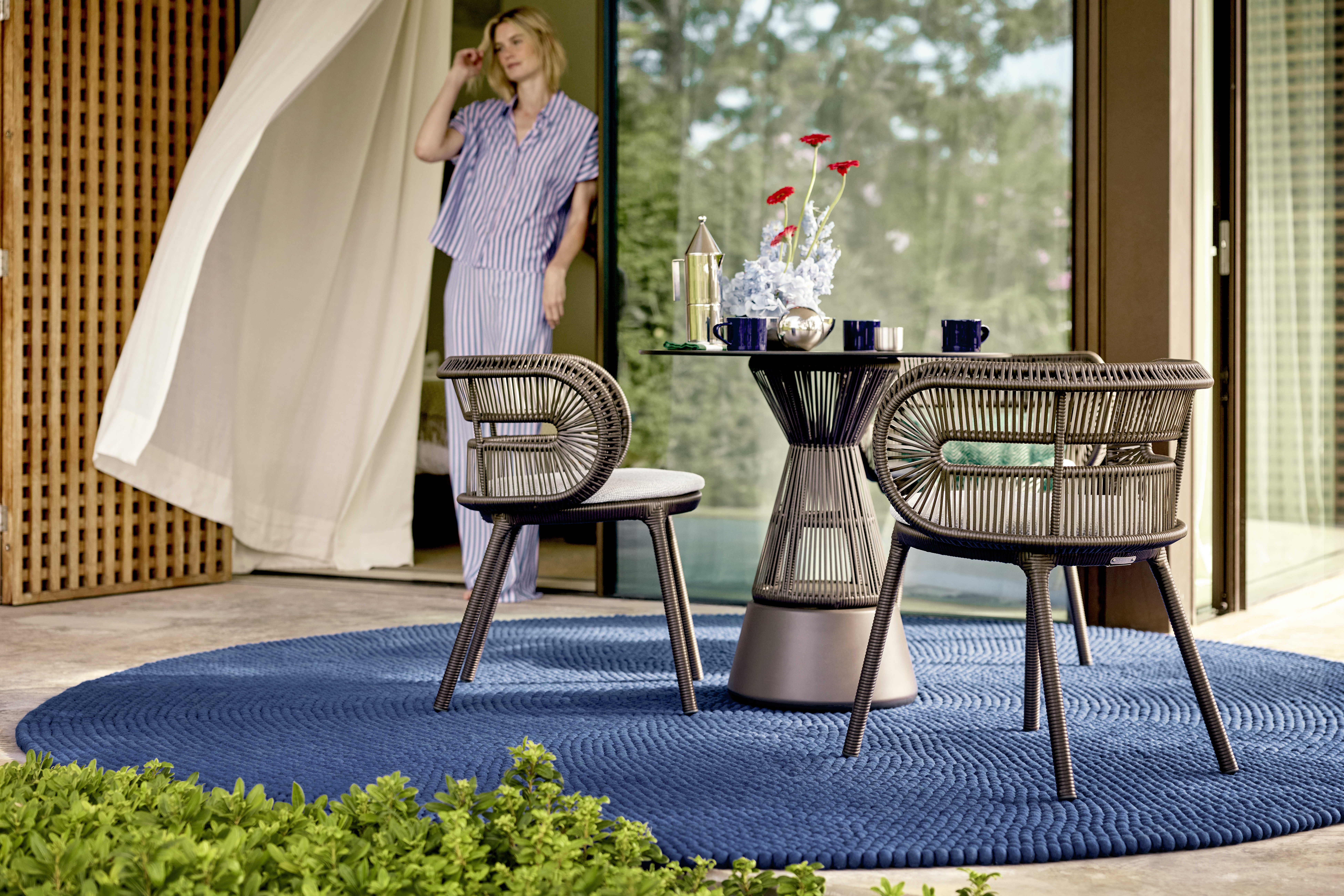 CIRQL NU umfasst kühne Konturen, atemberaubende Farben, ausdrucksstarke Details und technologische Innovationen. Das Geflecht schafft ein einzigartiges Zusammenspiel von Form und Farbe, das sich je nach Blickwinkel des Nutzers verändert. Dadurch gewinnen Armlehnstuhl und Sessel an Persönlichkeit und werden zu vielschichtigen, langlebigen Begleitern mit individueller Ausstrahlung. Optionale Sitzkissen sorgen für zusätzliche Eleganz und Entspannung, ebenso wie der Fußhocker oder der Beistelltisch. CIRQL NU ist ein haptisches und visuelles Meisterwerk, das sowohl allein als auch mit den DEDON Neuheiten 2024 und bestehenden Kollektionen wunderbar funktioniert.