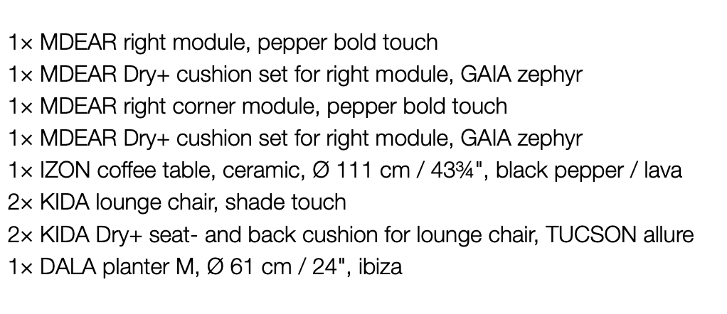 DEDON MBRACE Setting 01 Das DEDON MBRACE Setting 01 ist eine stilvoll abgestimmte Lounge-Komposition aus der MBRACE Kollektion von DEDON, entworfen von Yabu Pushelberg. Die Kollektion zeichnet sich durch ihre markante, weiche Formensprache, großzügige Polster und eine harmonische Balance zwischen skulpturaler Gestaltung und Outdoor-Tauglichkeit aus. MBRACE Setting 01 schafft eine einladende Lounge-Atmosphäre im Garten, auf der Terrasse oder am Pool – ideal für geselliges Beisammensein oder entspanntes Relaxen im Freien.Dieses Setting beinhaltet:2× MBRACE wing chair, alloro2× MBRACE seat cushion for wing chair, MUSE fossil2× MBRACE headrest cushion for wing chair, MUSE fossil1× MBRACE footstool, alloro1× MBRACE cushion for footstool, MUSE fossil1× MBRACE side table, Ø 50,5 cm / 20", chalk1× MDEAR left corner module, pepper bold touch1× MDEAR cushion set for left corner module, MUSE fossil1× MDEAR coffee table, 102,2 × 102,2 cm / 40¼" × 40¼", pepper bold touch1× DALA planter M, Ø 61 cm / 24", ibiza1× DALA planter L, Ø 76 cm / 30", ibiza