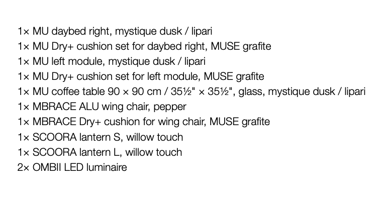 DEDON MU Setting 02 Das DEDON MU Setting 01 ist ein harmonisch abgestimmtes Lounge-Ensemble aus der MU-Kollektion von DEDON und wurde entworfen, um Outdoor-Lounges komfortabel, modern und einladend zu gestalten. Die MU-Reihe zeichnet sich durch klare, sanft kurvige Linien, leichte Formen und ein Zusammenspiel aus wetterbeständigen Materialien und gemütlichen Polstern aus – perfekt für Balkon, Terrasse, Garten oder Hotel-Lounges.Dieses Setting beinhaltet:1× MU 4-seater, mystique dusk / black pepper1× MU Dry+ cushion set for 4-seater, TUCSON malt2× SEAX lounge chair with teak-nished plywood, sail taupe / black pepper1× IZON coffee table, Ø 111 cm / 43¾", black pepper / lava1× LOON lamp S1× LOON lamp L1× OMBII LED luminaire
