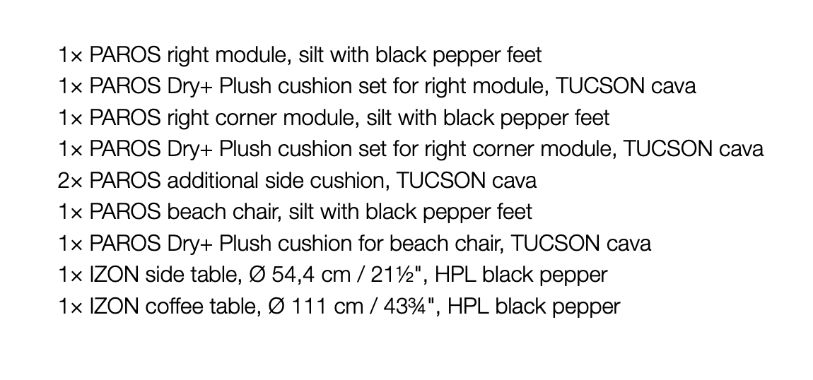 DEDON Paros Setting 01 Das DEDON PAROS Setting 01 ist ein flexibles, stylisches Lounge-Ensemble aus der PAROS Kollektion von DEDON, entworfen von Bernhard-Radermacher. PAROS zeichnet sich durch eine geometrisch klare Formensprache, moderne Proportionen und komfortable Polster aus, die zusammen ein einladendes Wohnzimmer-Gefühl im Außenbereich schaffen. Die Module lassen sich individuell kombinieren und zu großzügigen Lounge-Layouts arrangieren – ideal für Terrasse, Garten, Balkon oder Hospitality-Bereiche.Dieses Setting beinhaltet: 1× PAROS 3-seater, silt with black pepper feet1× PAROS Dry+ Plush cushion set for 3-seater, MUSE ivory1× PAROS 2-seater, silt with black pepper feet1× PAROS Dry+ Plush cushion set for 2-seater, MUSE ivory4× PAROS additional side cushion, MUSE ivory1× IZON coffee table 120 × 120 cm / 47¼" × 47¼", black pepper / black pepper1× IZON coffee table 130 × 50 cm / 51¼" × 19¾", black pepper / black pepper1× DALA planter S, rioja1× DALA planter M, rioja2× OMBII LED luminaire