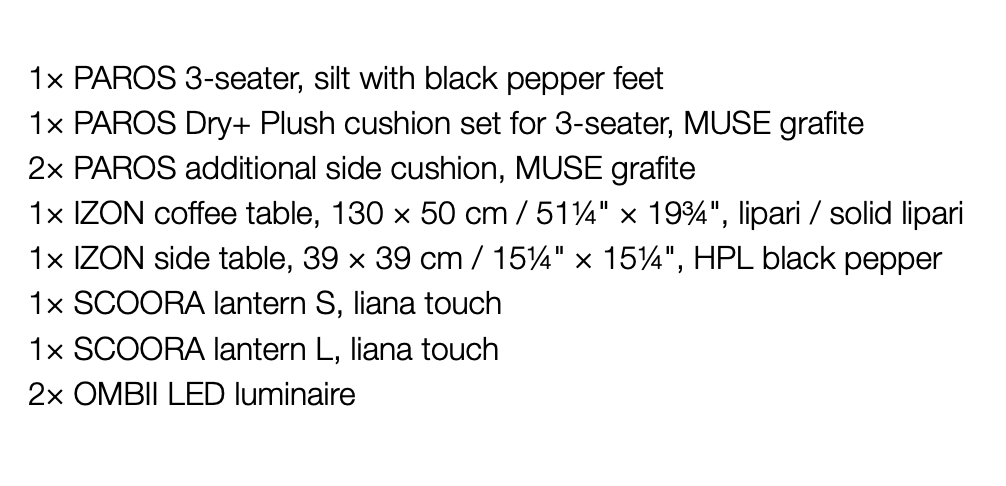 DEDON Paros Setting 01 Das DEDON PAROS Setting 01 ist ein flexibles, stylisches Lounge-Ensemble aus der PAROS Kollektion von DEDON, entworfen von Bernhard-Radermacher. PAROS zeichnet sich durch eine geometrisch klare Formensprache, moderne Proportionen und komfortable Polster aus, die zusammen ein einladendes Wohnzimmer-Gefühl im Außenbereich schaffen. Die Module lassen sich individuell kombinieren und zu großzügigen Lounge-Layouts arrangieren – ideal für Terrasse, Garten, Balkon oder Hospitality-Bereiche.Dieses Setting beinhaltet: 1× PAROS 3-seater, silt with black pepper feet1× PAROS Dry+ Plush cushion set for 3-seater, MUSE ivory1× PAROS 2-seater, silt with black pepper feet1× PAROS Dry+ Plush cushion set for 2-seater, MUSE ivory4× PAROS additional side cushion, MUSE ivory1× IZON coffee table 120 × 120 cm / 47¼" × 47¼", black pepper / black pepper1× IZON coffee table 130 × 50 cm / 51¼" × 19¾", black pepper / black pepper1× DALA planter S, rioja1× DALA planter M, rioja2× OMBII LED luminaire