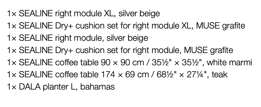 DEDON SEALINE Setting 01 Das DEDON Sealine Setting 01 ist ein stilvoll abgestimmtes Lounge-Ensemble aus der Sealine-Kollektion von DEDON, entworfen von Winfried O. Hennig. Die Kollektion zeichnet sich durch eine organische Linienführung, großzügige Polster und wetterbeständige Materialien aus, die zusammen eine komfortable, entspannte Outdoor-Atmosphäre schaffen. Der Name Sealine verweist auf das beruhigende Gefühl von Wasser und Landschaft – umgesetzt in geschwungene, einladende Formen, die sowohl optisch als auch haptisch höchsten Komfort bieten.Das Setting 01 kombiniert typische Sealine-Module zu einer harmonischen Lounge-Kombination, die sich ideal für Terrasse, Garten, Balkon oder Poolbereich eignet. Jede Komponente ist aufeinander abgestimmt und schafft ein einladendes Lounge-Umfeld mit großzügiger Sitzfläche und komfortabler Polsterung. Dieses Setting beinhaltet: 1× SEALINE 2-seater, silver beige1× SEALINE Dry+ cushion set for 2-seater, MUSE sylt1× SEALINE extended daybed right, silver beige1× SEALINE Dry+ cushion set for extended daybed right, MUSE sylt4× SEALINE Dry+ additional back cushion, TUCSON cava1× SEALINE coffee table 174 × 69 cm / 68½" × 27¼", teak1× LOON floor lamp S1× LOON floor lamp L