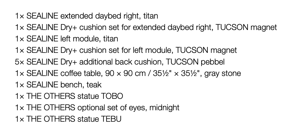 DEDON SEALINE Setting 01 Das DEDON Sealine Setting 01 ist ein stilvoll abgestimmtes Lounge-Ensemble aus der Sealine-Kollektion von DEDON, entworfen von Winfried O. Hennig. Die Kollektion zeichnet sich durch eine organische Linienführung, großzügige Polster und wetterbeständige Materialien aus, die zusammen eine komfortable, entspannte Outdoor-Atmosphäre schaffen. Der Name Sealine verweist auf das beruhigende Gefühl von Wasser und Landschaft – umgesetzt in geschwungene, einladende Formen, die sowohl optisch als auch haptisch höchsten Komfort bieten.Das Setting 01 kombiniert typische Sealine-Module zu einer harmonischen Lounge-Kombination, die sich ideal für Terrasse, Garten, Balkon oder Poolbereich eignet. Jede Komponente ist aufeinander abgestimmt und schafft ein einladendes Lounge-Umfeld mit großzügiger Sitzfläche und komfortabler Polsterung. Dieses Setting beinhaltet: 1× SEALINE 2-seater, silver beige1× SEALINE Dry+ cushion set for 2-seater, MUSE sylt1× SEALINE extended daybed right, silver beige1× SEALINE Dry+ cushion set for extended daybed right, MUSE sylt4× SEALINE Dry+ additional back cushion, TUCSON cava1× SEALINE coffee table 174 × 69 cm / 68½" × 27¼", teak1× LOON floor lamp S1× LOON floor lamp L