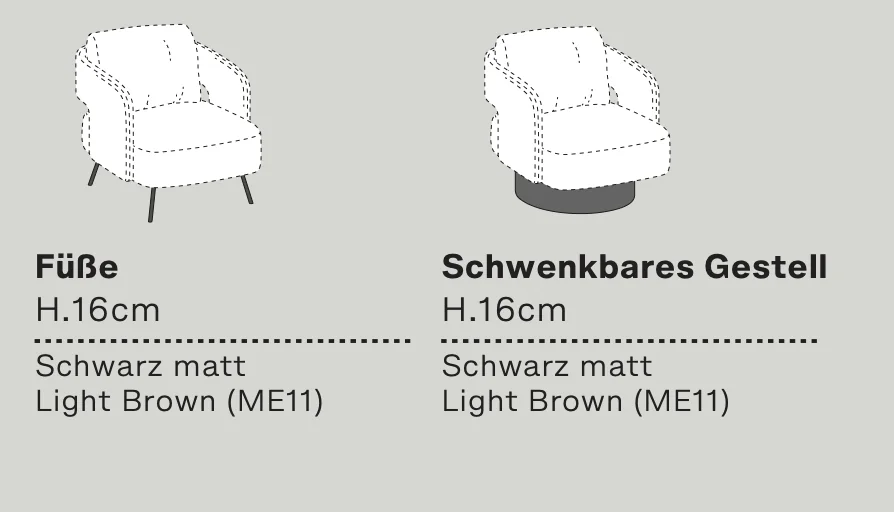 - Füße / Schwenkbares Gestell: Schwarz matt oder Light brown