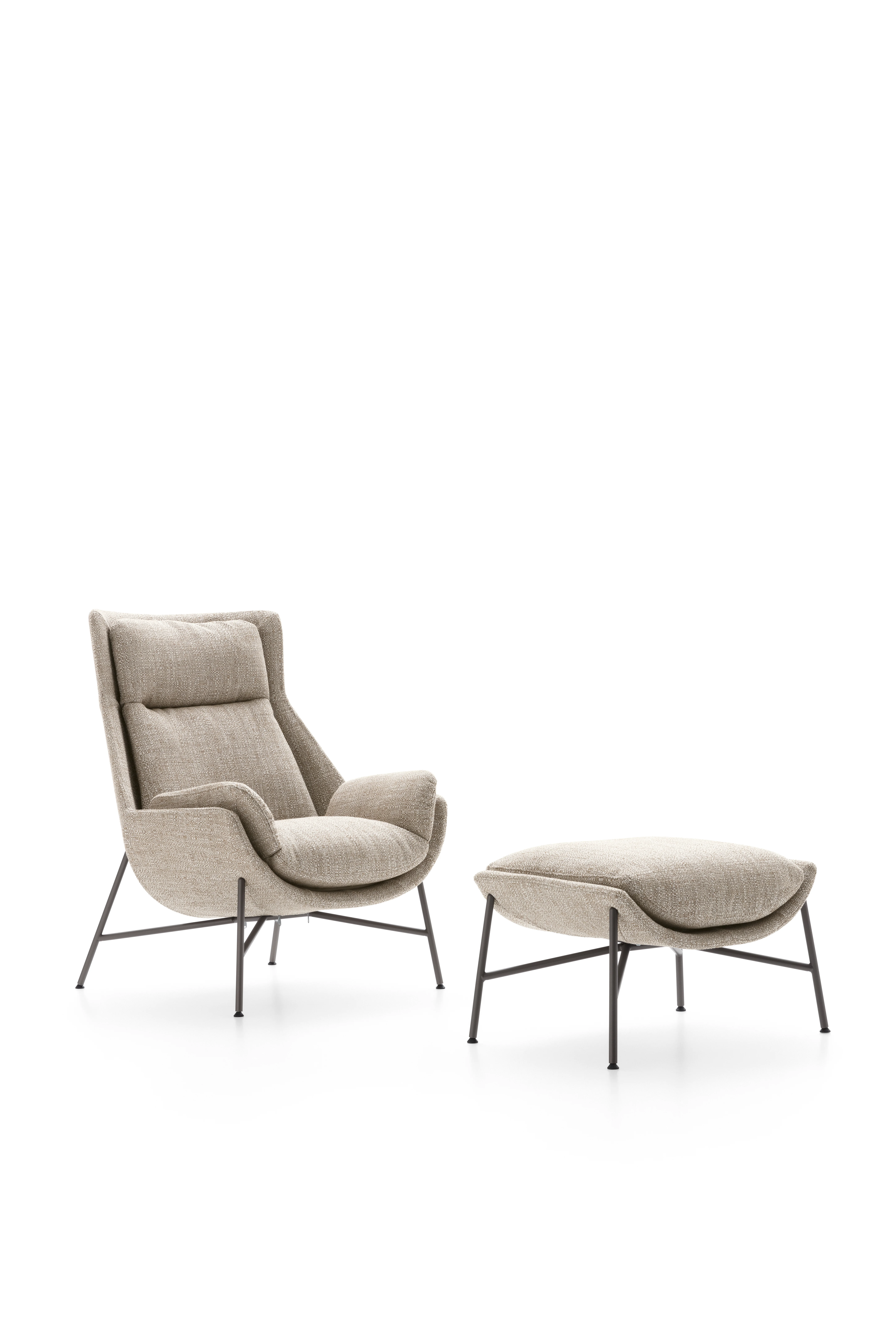DITRE ITALIA ALTA SesselAlta von Ditre – Design in seiner schönsten Form Für Patrick Norguet ist ein Sofa weit mehr als nur eine Sitzgelegenheit – es ist der Mittelpunkt des Wohnens. Alta hebt das Konzept von Komfort auf ein neues Niveau und übersetzt es in eine Form, die weich, großzügig und einladend wirkt – auch optisch. Inspiriert von einem Baumwollknäuel entsteht das Volumen des Sofas durch ein horizontales Element, das das Material sanft zusammendrückt und seine Kontur definiert. Das Ergebnis ist eine Gestalt, die förmlich dazu einlädt, die Füße hochzulegen und vollkommen zu entspannen.Gestell / Struktur: Tragende Elemente aus Tannenholz. Struktur in Mehrschichtholzplatten der Klasse E1, Füllplatten aus HartfaserplattenFederung: Rückenlehne in Hartfaserplatte; Sitz in gekreuzten und mechanisch vorgespannten elastischen Bändern aus Propyplenfasern und LatexStoffe sind nicht abziehbarGewicht: 37 kgFüße serienmäßig: Schwarzes MetallMaße (B × T × H) : 104 x 93 x 79 cm Weitere Stoffe finden Sie im beigefügten Ditre-Stoffkatalog. Bei Interesse an nicht abgebildeten Varianten kontaktieren Sie uns gerne.Bitte beachten Sie, dass die angezeigten Bilder Illustrationszwecken dienen und von dem tatsächlichen Endprodukt abweichen können.
