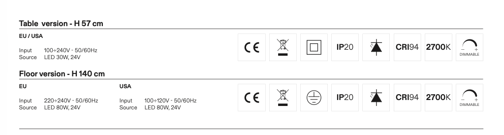 - Stehleuchte-Version (H. 140 CM): Netzteil in Produkt eingesetzt (Output/Ausgang: 24 V). Stromkabel mit integriertem Dimmer. Version: EUROPA