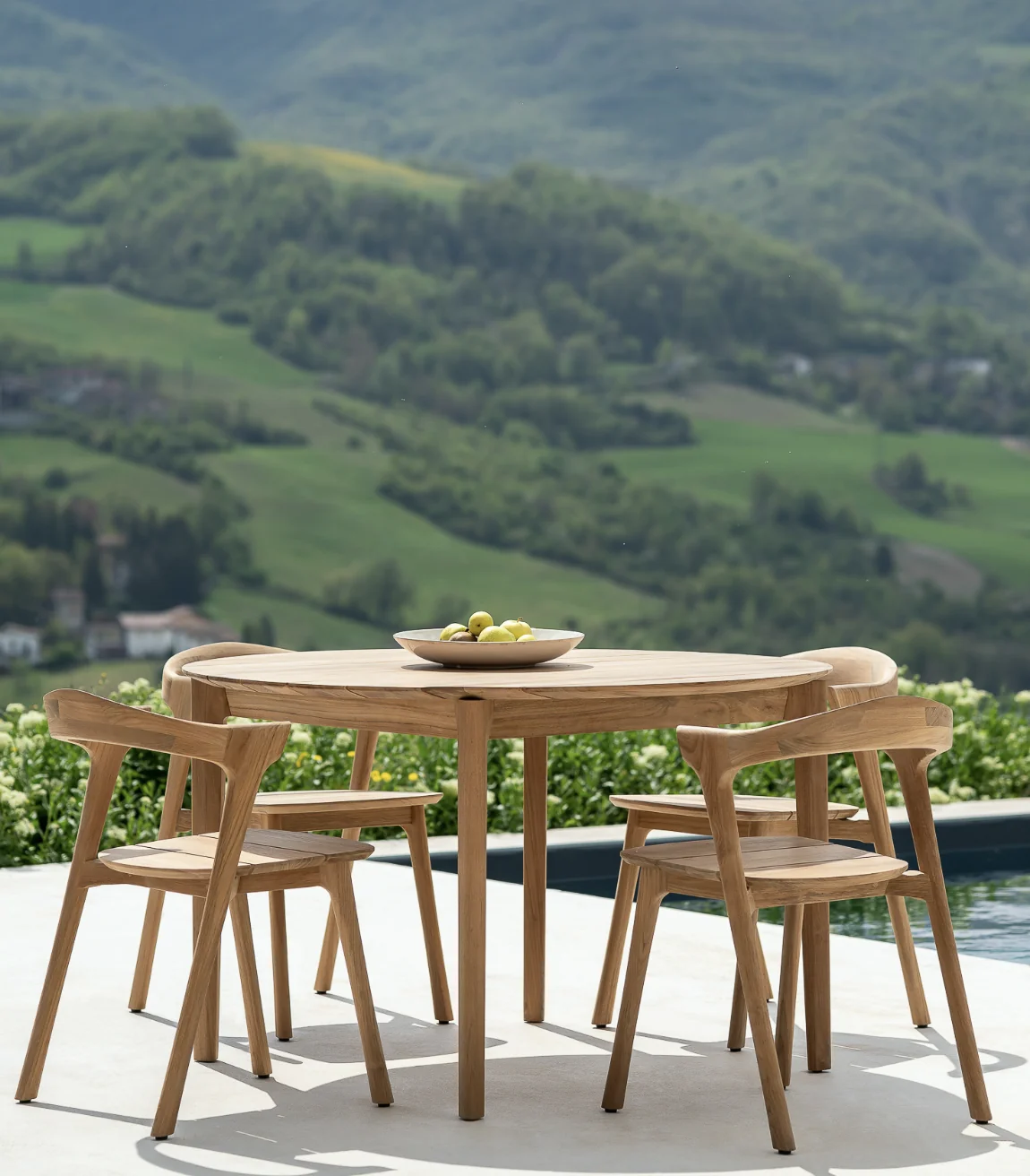 ETHNICRAFT BOK Esstisch Outdoor • Teakholz • rundDer CIRCLE Esstisch soll Sie dazu inspirieren, mehr Zeit zu Tisch zu verbringen. Seine soliden Beine verflechten sich in harmonischer Balance, während das angepasste Design das Leben im Freien zu einem einfachen Vergnügen macht. Für den Einsatz im Außenbereich geeignet.Maximale Belastbarkeit: 105 kgLänge: 136 cm Breite: 136 cm Höhe: 41,7 cm Eigengewicht: 27,6 kg Nicht ausziehbar Bequeme Sitzkapazität: bis zu 4 Personen Material: TeakBodenschoner: JaMassivholz Weitere Informationen finden Sie hier: Pflegehinweise für die Outdoor-Kollektionen Bitte beachten Sie, dass die angezeigten Bilder Illustrationszwecken dienen und von dem tatsächlichen Endprodukt abweichen können. Um die natürliche Schönheit des Materials zu unterstreichen, wird dieses Produkt aus Teakholz ohne jegliche Oberflächen- oder Schutzbehandlung geliefert. Entworfen von Alain van Havre