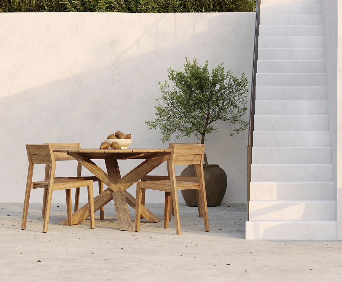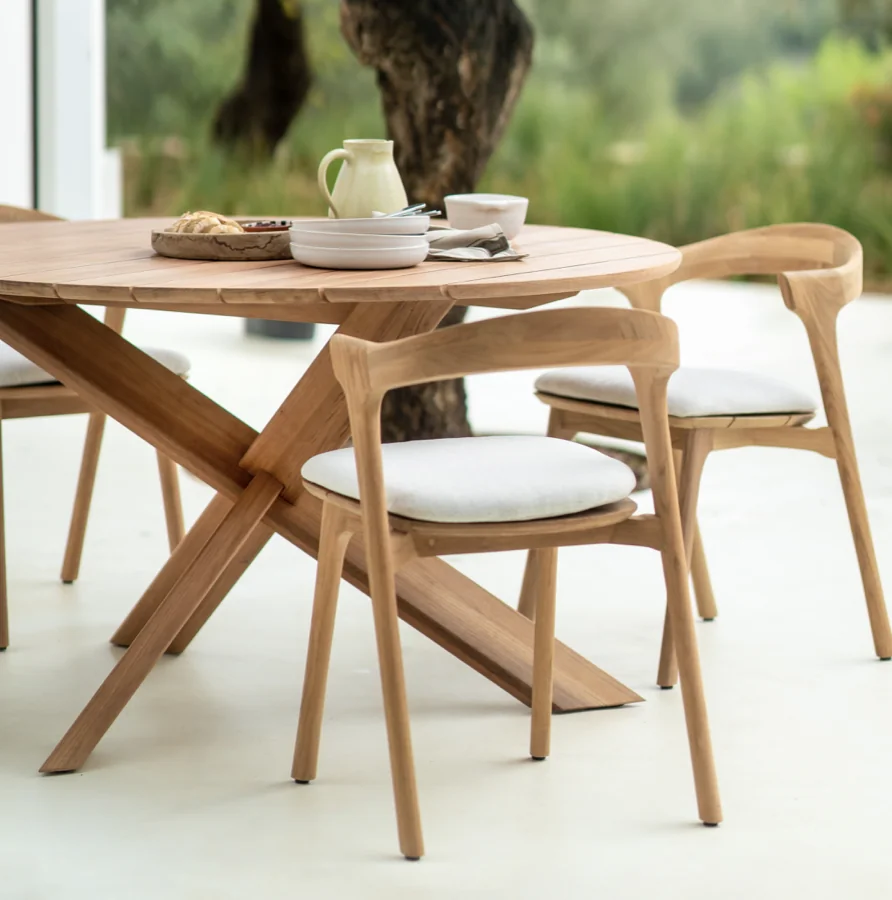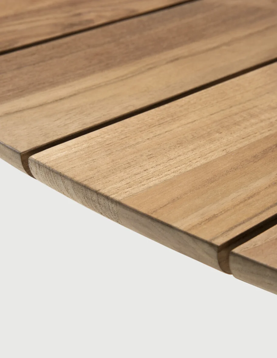 ETHNICRAFT BOK Esstisch Outdoor • Teakholz • rundInspiriert von der geschwungenen Eleganz von Ziegenhörnern vereint die Bok-Kollektion skulpturale Raffinesse mit moderner Handwerkskunst. Das Ergebnis: ein Esstisch, der nicht nur durch seine anmutige Silhouette besticht, sondern auch durch seine durchdachte Funktionalität. Wie der dazugehörige Stuhl ist auch der Bok-Esstisch ein echtes Statement-Piece. Seine organisch fließende Form wirkt leicht und lässig, während die solide Konstruktion aus massivem Teakholz für Stabilität und Langlebigkeit sorgt – drinnen wie draußen. Die fein genutete Tischplatte ist nicht nur ein Blickfang, sondern auch besonders praktisch: Sie lässt Regenwasser einfach abfließen und macht den Tisch zu einem idealen Begleiter für das Leben im Freien. Ob für gesellige Abende oder stille Momente – der Bok-Tisch vereint zeitloses Design mit echter Alltagstauglichkeit und wird so schnell zum Lieblingsort im Zuhause. Für den Einsatz im Außenbereich geeignet.Maximale Belastbarkeit: 60 kgLänge: 125 cm Breite:125 cm Höhe: 76 cm Eigengewicht: 27,6 kg Nicht ausziehbar Bequeme Sitzkapazität: bis zu 4 Personen Material: TeakNicht gebürstet Weitere Informationen finden Sie hier: Pflegehinweise für die Outdoor-Kollektionen Bitte beachten Sie, dass die angezeigten Bilder Illustrationszwecken dienen und von dem tatsächlichen Endprodukt abweichen können. Um die natürliche Schönheit des Materials zu unterstreichen, wird dieses Produkt aus Teakholz ohne jegliche Oberflächen- oder Schutzbehandlung geliefert. Entworfen von Alain van Havre