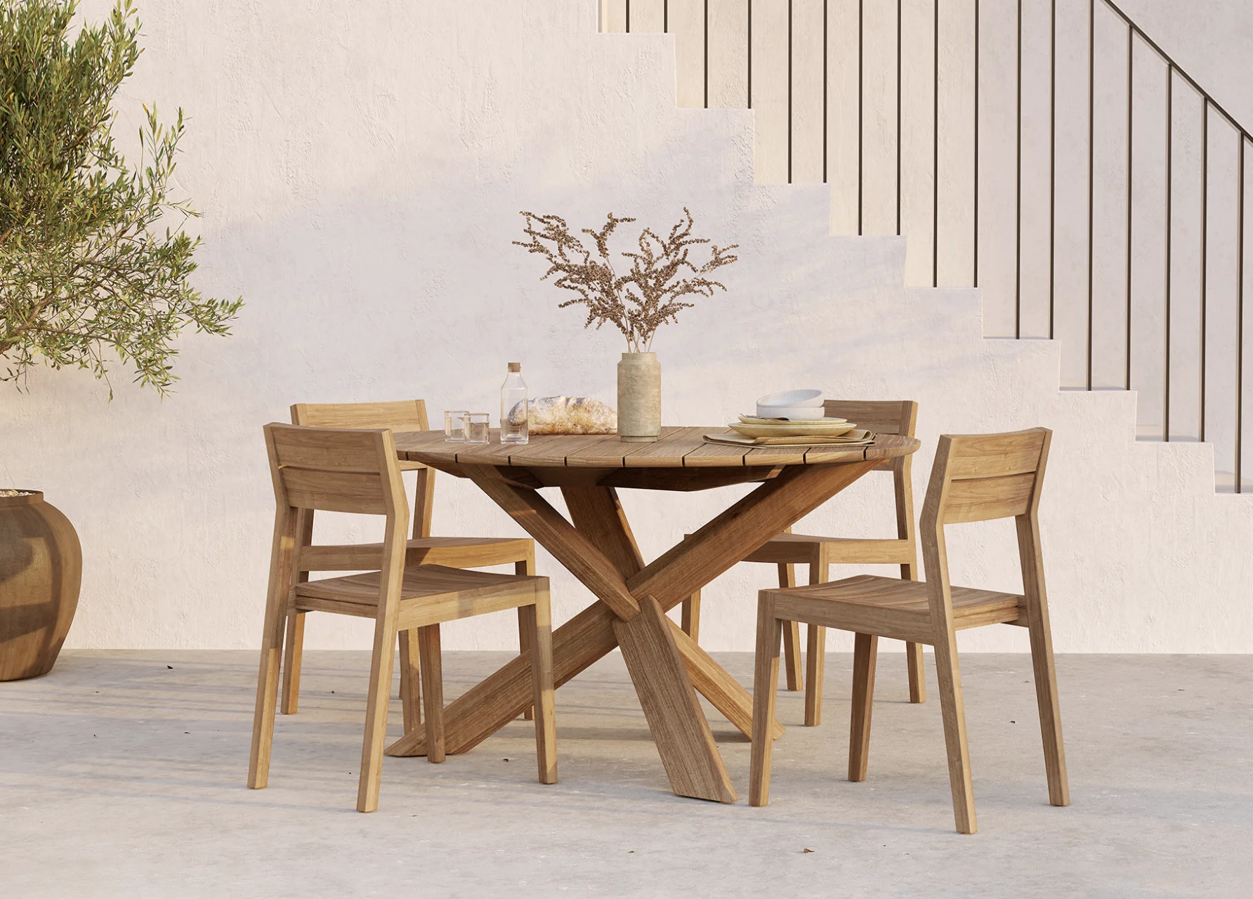 ETHNICRAFT EX1 Stuhl Outdoor • TeakholzEin geschätztes Möbelstück für den Innenbereich – der Esszimmerstuhl EX 1 – zeigt sich auch im Außenbereich von seiner besten Seite. Gefertigt aus massivem Teakholz, vereint dieses zeitlose Design mühelose Stabilität mit stilvoller Präsenz für Ihre Sitzgelegenheiten im Freien. Für den Einsatz im Außenbereich geeignet.Maximale Belastbarkeit: 135 kgLänge: 43 cm Breite: 56 cm Höhe: 83 cm Sitzhöhe: 47 cmEigengewicht: 6 kg Material: Teakholz Bodenschoner: JaMassivholz Weitere Informationen finden Sie hier: Pflegehinweise für die Outdoor-Kollektionen Konkrete Maße des StuhlsBitte beachten Sie, dass die angezeigten Bilder Illustrationszwecken dienen und von dem tatsächlichen Endprodukt abweichen können. Um die natürliche Schönheit des Materials zu unterstreichen, wird dieses Produkt aus Teakholz ohne jegliche Oberflächen- oder Schutzbehandlung geliefert.Entworfen von Alain van Havre