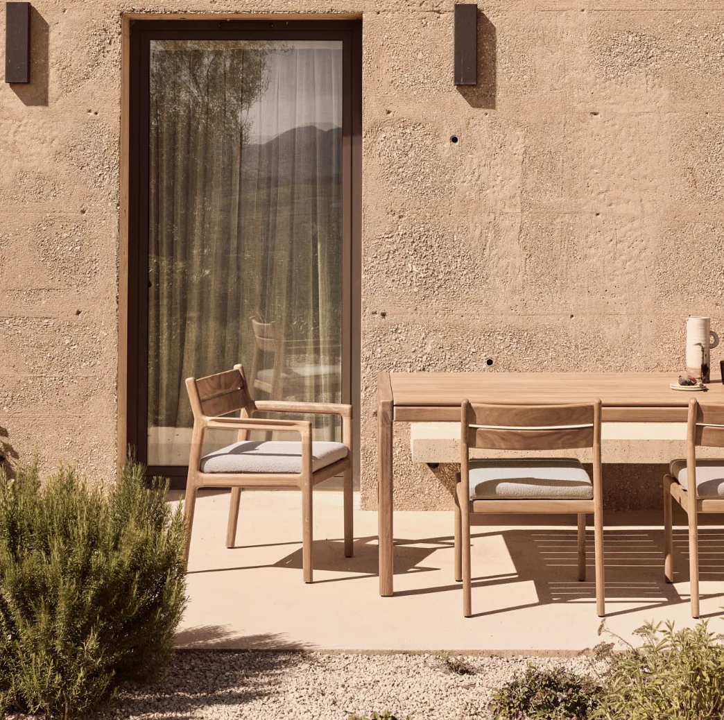 ETHNICRAFT EX1 Stuhl Outdoor • TeakholzEin geschätztes Möbelstück für den Innenbereich – der Esszimmerstuhl EX 1 – zeigt sich auch im Außenbereich von seiner besten Seite. Gefertigt aus massivem Teakholz, vereint dieses zeitlose Design mühelose Stabilität mit stilvoller Präsenz für Ihre Sitzgelegenheiten im Freien. Für den Einsatz im Außenbereich geeignet.Maximale Belastbarkeit: 135 kgLänge: 43 cm Breite: 56 cm Höhe: 83 cm Sitzhöhe: 47 cmEigengewicht: 6 kg Material: Teakholz Bodenschoner: JaMassivholz Weitere Informationen finden Sie hier: Pflegehinweise für die Outdoor-Kollektionen Konkrete Maße des StuhlsBitte beachten Sie, dass die angezeigten Bilder Illustrationszwecken dienen und von dem tatsächlichen Endprodukt abweichen können. Um die natürliche Schönheit des Materials zu unterstreichen, wird dieses Produkt aus Teakholz ohne jegliche Oberflächen- oder Schutzbehandlung geliefert.Entworfen von Alain van Havre