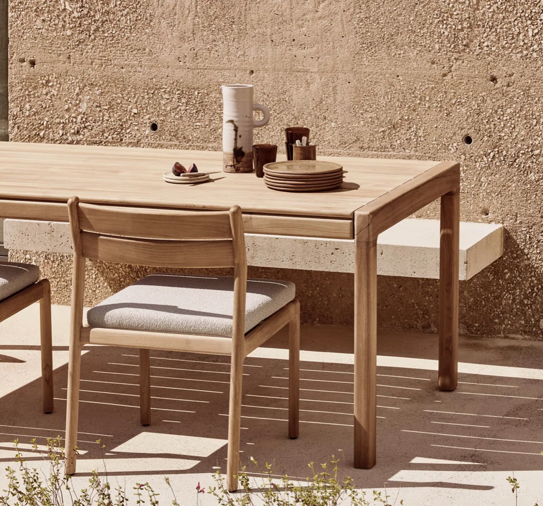 ETHNICRAFT BOK Esstisch Outdoor • Teakholz Inspiriert von der geschwungenen Eleganz von Ziegenhörnern vereint die Bok-Kollektion skulpturale Raffinesse mit moderner Handwerkskunst. Das Ergebnis: ein Esstisch, der nicht nur durch seine anmutige Silhouette besticht, sondern auch durch seine durchdachte Funktionalität. Wie der dazugehörige Stuhl ist auch der Bok-Esstisch ein echtes Statement-Piece. Seine organisch fließende Form wirkt leicht und lässig, während die solide Konstruktion aus massivem Teakholz für Stabilität und Langlebigkeit sorgt – drinnen wie draußen. Die fein genutete Tischplatte ist nicht nur ein Blickfang, sondern auch besonders praktisch: Sie lässt Regenwasser einfach abfließen und macht den Tisch zu einem idealen Begleiter für das Leben im Freien. Ob für gesellige Abende oder stille Momente – der Bok-Tisch vereint zeitloses Design mit echter Alltagstauglichkeit und wird so schnell zum Lieblingsort im Zuhause. Für den Einsatz im Außenbereich geeignet.Länge: 162 cm Breite: 80 cm Höhe: 76 cm Eigengewicht: 32 kg Nicht ausziehbar Bequeme Sitzkapazität: bis zu 6 Personen Material: TeakTeakholz schwarz: Hergestellt aus 100% massivem, schwarz gebeiztem und gebürstetem Teakholz mit einer Lackierung. Weitere Informationen finden Sie hier: Pflegehinweise für die Outdoor-Kollektionen Bitte beachten Sie, dass die angezeigten Bilder Illustrationszwecken dienen und von dem tatsächlichen Endprodukt abweichen können. Um die natürliche Schönheit des Materials zu unterstreichen, wird dieses Produkt aus Teakholz ohne jegliche Oberflächen- oder Schutzbehandlung geliefert. Entworfen von Alain van Havre