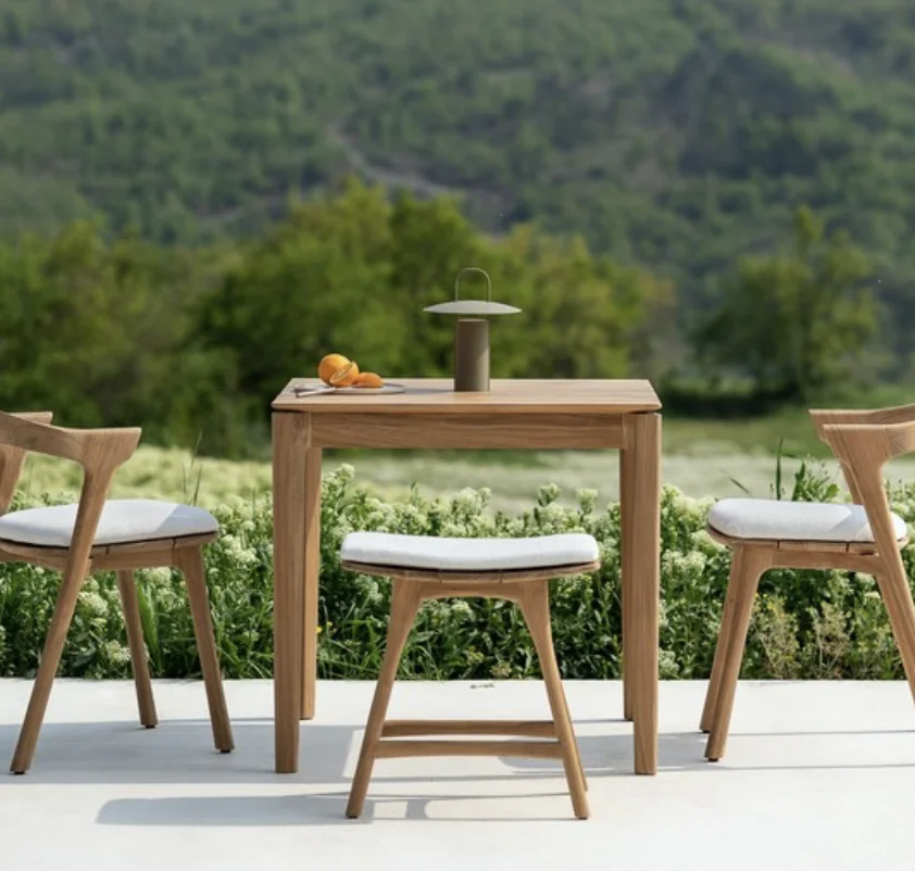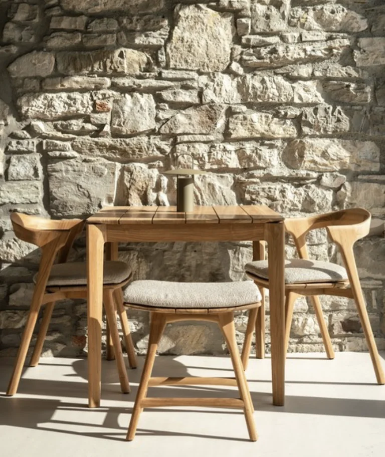 ETHNICRAFT BOK Stuhl Outdoor • TeakholzSkulpturale Leichtigkeit für draußen – die Bok-Kollektion besticht durch ihre organische Form, inspiriert von den geschwungenen Hörnern einer Ziege. Sie vereint moderne Handwerkskunst mit zeitloser Eleganz. Die Bok Outdoor-Bankbringt dieses ikonische Design jetzt auch nach draußen – ideal als stilvolle Ergänzung zum Bok Esstisch, aber auch für sich allein ein echter Hingucker. Leicht, anmutig und geschaffen für besondere Momente im Freien. Für den Einsatz im Außenbereich geeignet.Maximale Belastbarkeit: 135 kgLänge: 50 cm Breite: 54 cm Höhe: 76 cm Sitzhöhe: 47 cmEigengewicht: 5,8 kg Material: Teakholz MassivholzBodenschoner: JaArt der Polsterung: 100% Polypropylen Schaumtyp: schnelltrocknender Schaumstoff, oben und an den Seiten mit einer Dacronschicht versehen und mit Charmeuse überzogenTeakholz schwarze Ausführung: hergestellt aus 100% massivem, schwarz gebeiztem und gebürstetem Teakholz mit einer Lackierung Weitere Informationen finden Sie hier: Pflegehinweise für die Outdoor-Kollektionen Konkrete Maße des StuhlsBitte beachten Sie, dass die angezeigten Bilder Illustrationszwecken dienen und von dem tatsächlichen Endprodukt abweichen können. Um die natürliche Schönheit des Materials zu unterstreichen, wird dieses Produkt aus Teakholz ohne jegliche Oberflächen- oder Schutzbehandlung geliefert (Ausnahme: Teakholz schwarz)Entworfen von Alain van Havre