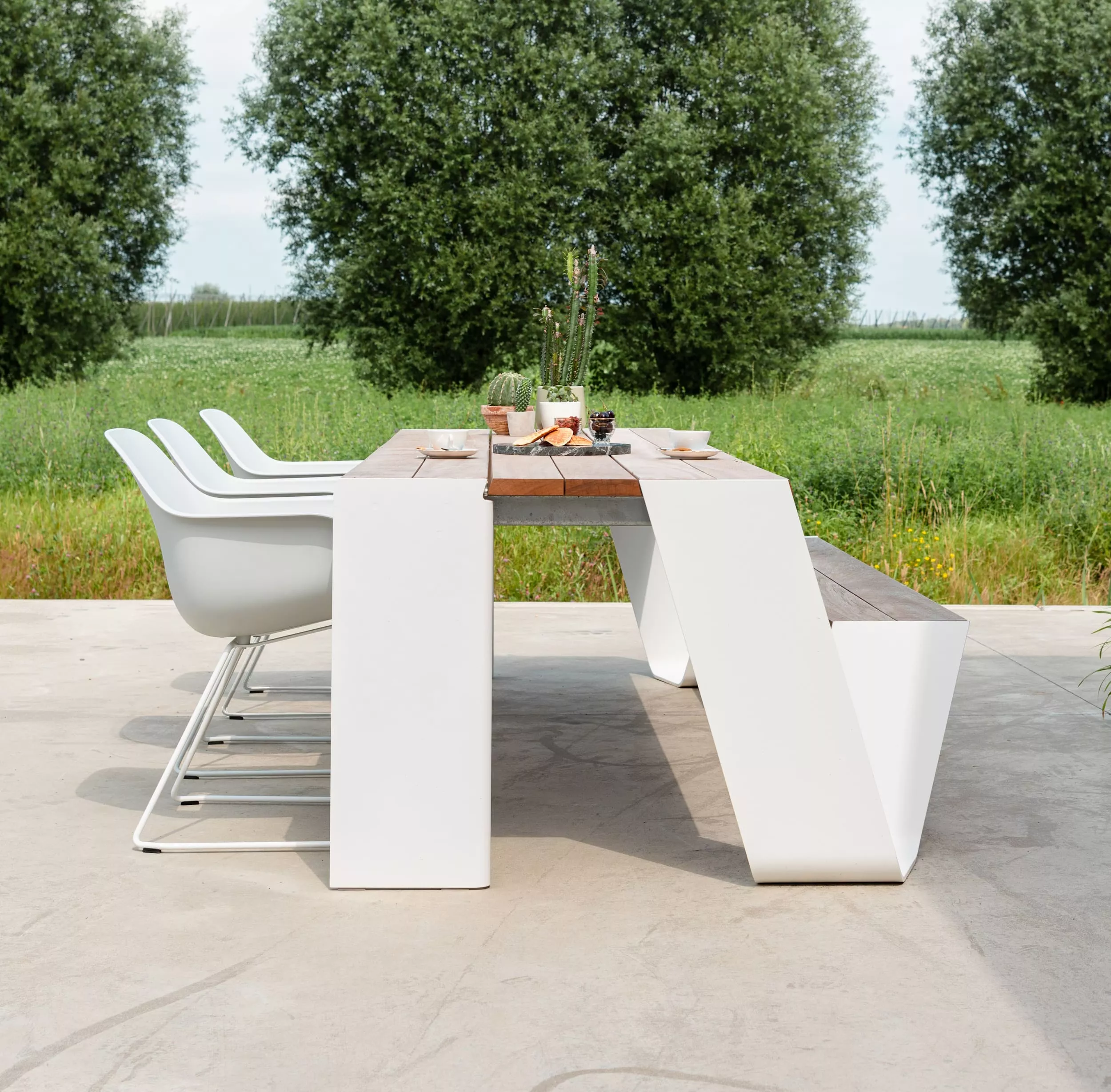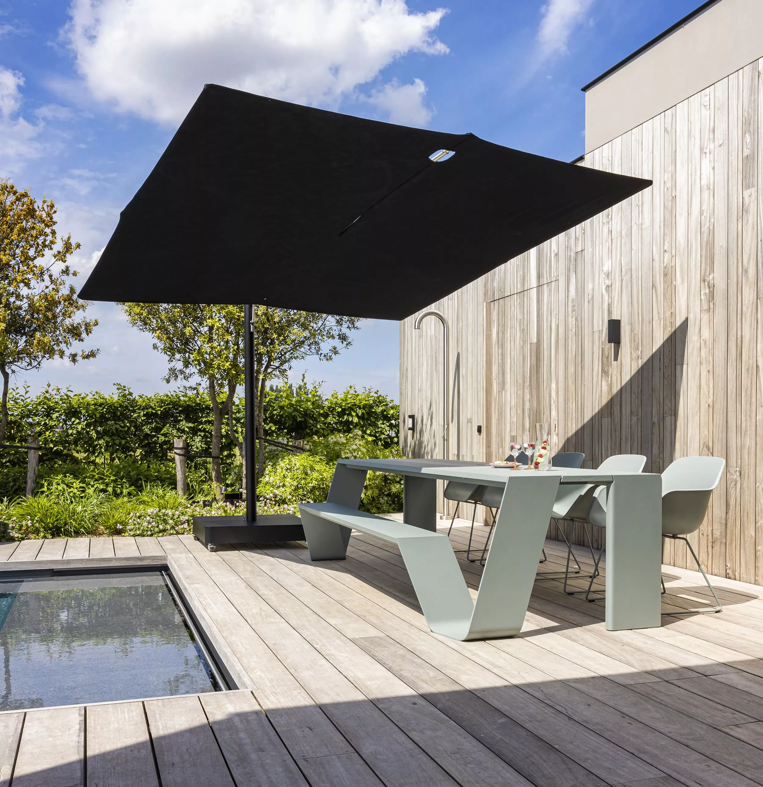 | Material Tischplatte: | Aluminium, Hellwood, Iroko-Hartholz |