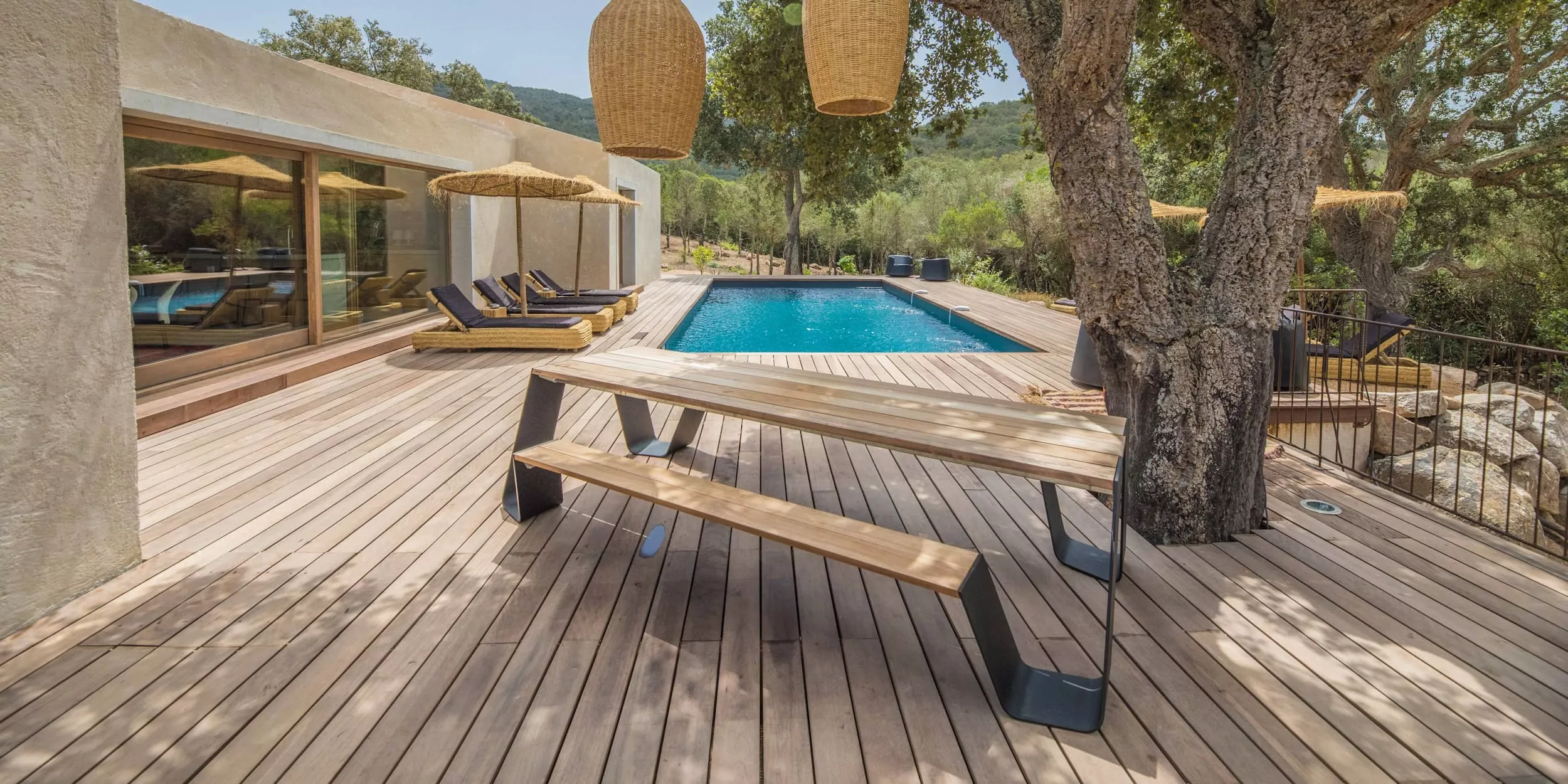 - Holzelemte, Sitzfläche aus Iroko-Hartholz, Hellwood