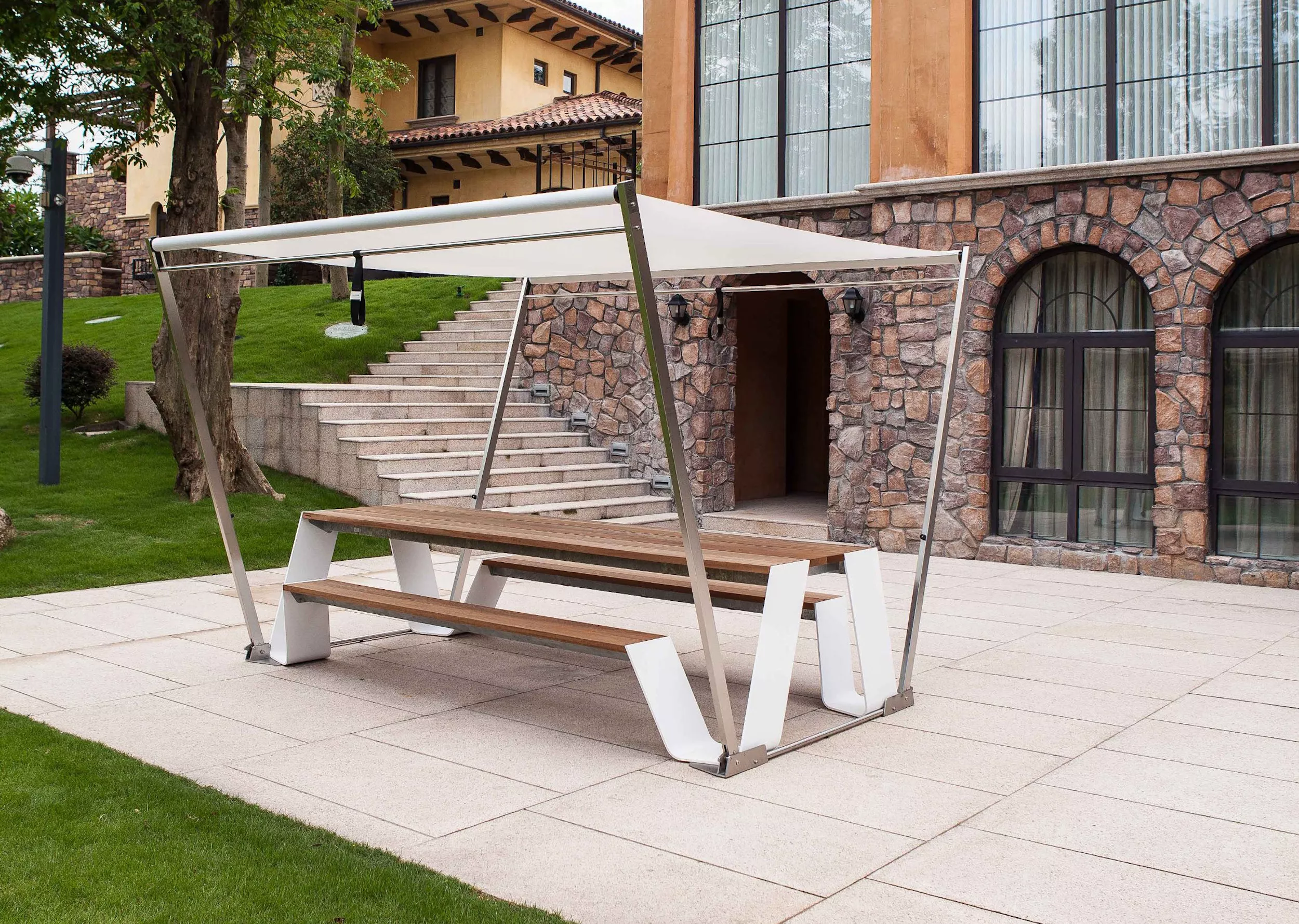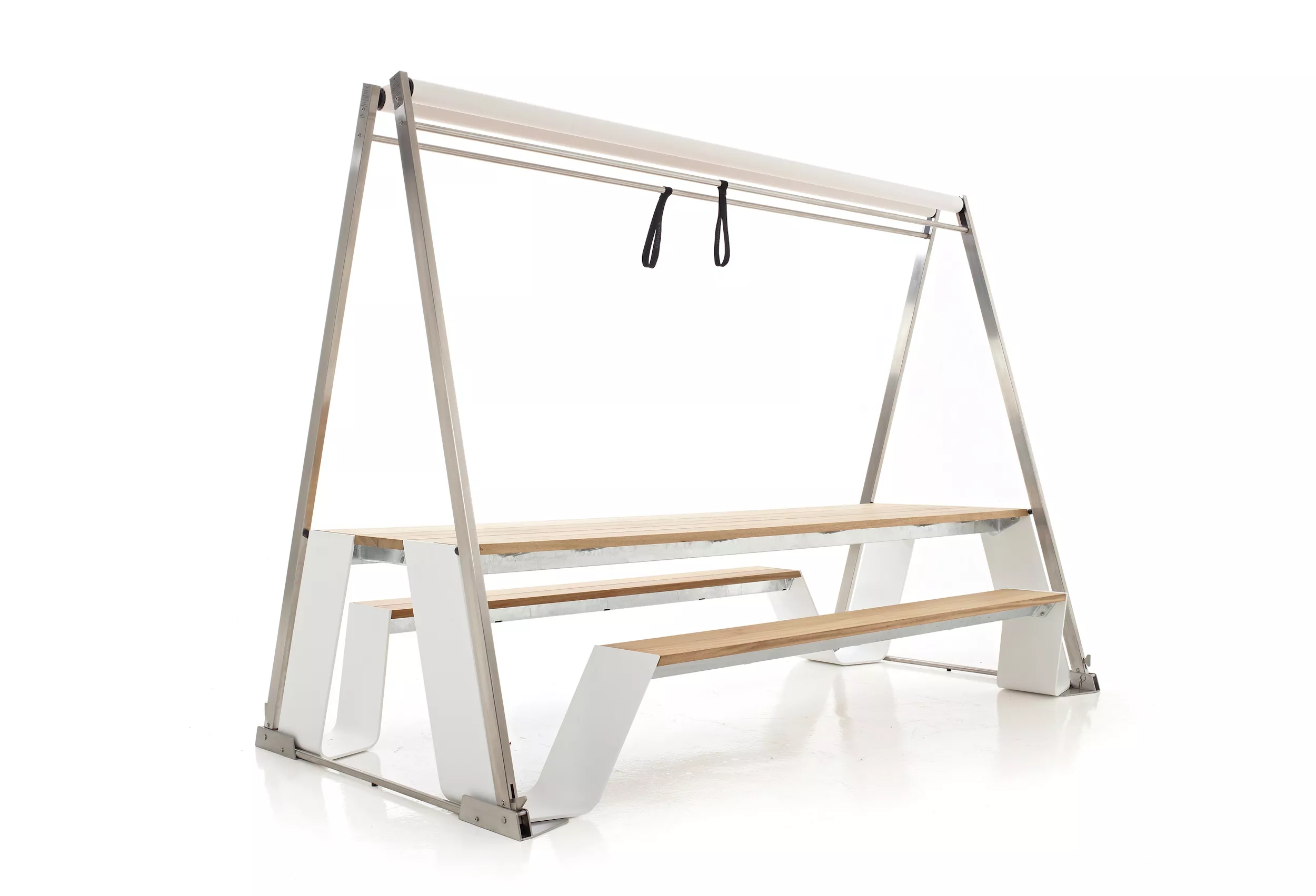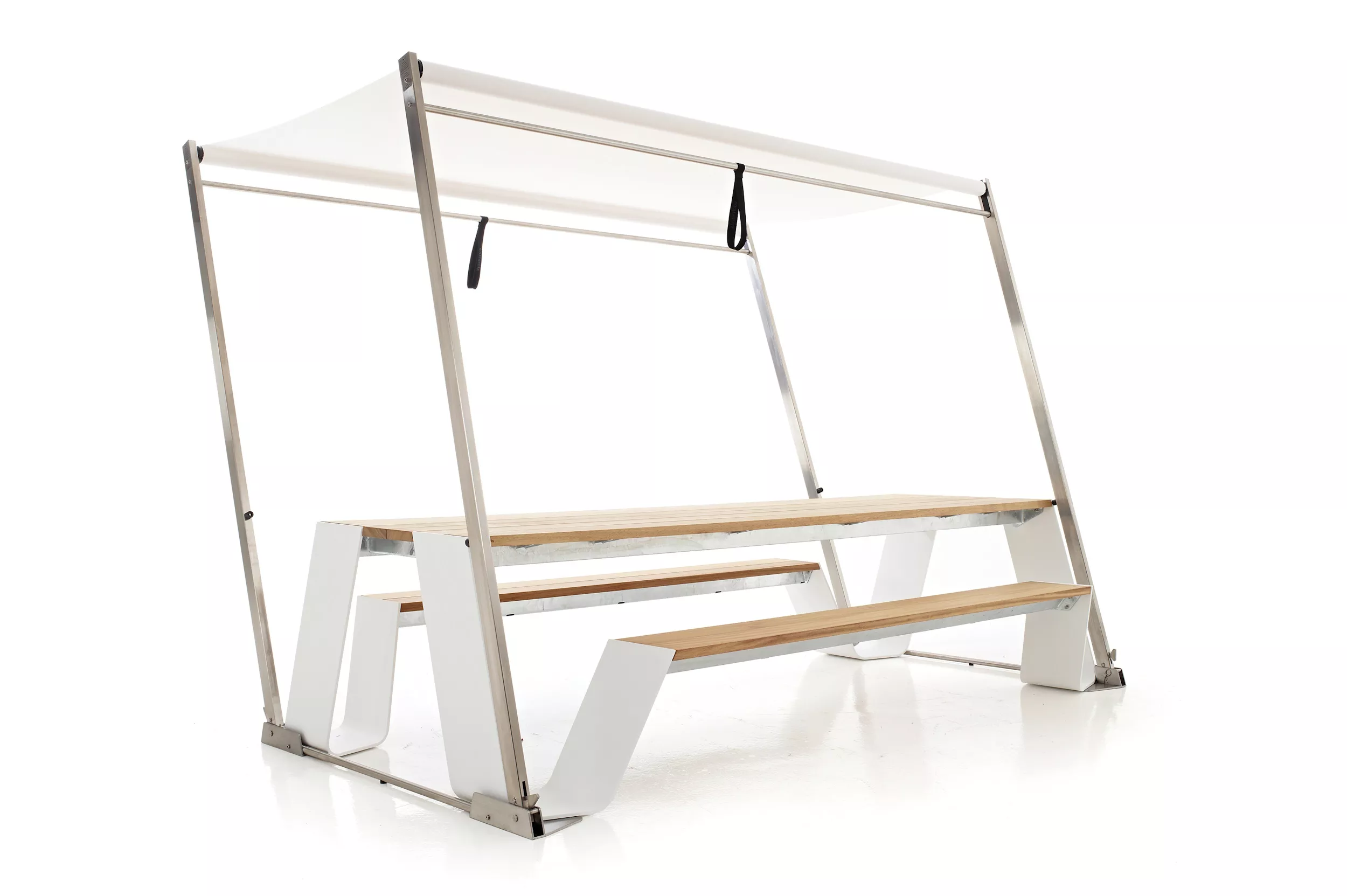 Der Hopper Shade harmoniert in seiner geöffneten und geschlossenen Position perfekt mit den Linien des Hopper-Designs. Sein Design wurde sorgfältig gestaltet, um eine nahtlose Integration mit dem Tisch zu gewährleisten. Durch einen intelligenten internen Federmechanismus kann der Schirm mühelos geöffnet und geschlossen werden, ohne dabei zusätzlichen Platz neben dem Tisch einzunehmen. Dieser zusammenklappbare Baldachin bietet nicht nur Schutz vor der Sonne, sondern trägt auch maßgeblich zur ästhetischen Gesamterscheinung bei. Mit seiner Fähigkeit, auf einfache und dennoch ansprechende Weise genug Schatten für alle zu schaffen, ist der Hopper Shade eine praktische und stilvolle Ergänzung zu Ihrem Outdoor-Bereich.
