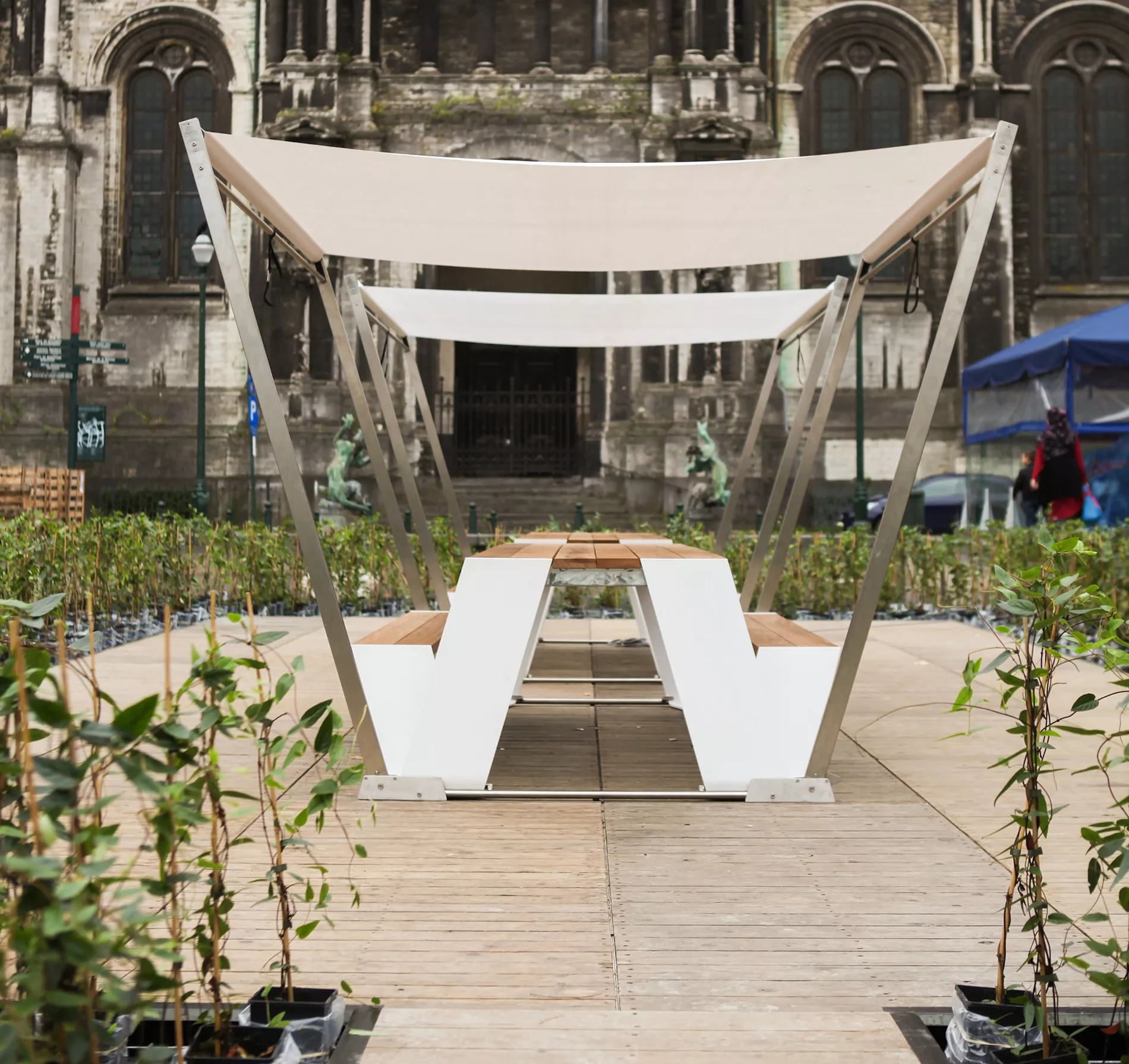 EXTREMIS HOPPER picnic 300 mit Sonnenschirm-Vorbereitung Hopper bietet eine innovative Lösung für das traditionelle Konzept eines Picknicktisches. Dank der leicht zugänglichen Bänke entfällt das lästige "Über-die-Bank-Steigen" vollständig. Das Design, das sich durch seine verdeckten Beine und die nahtlose Verbindung zur Tischplatte auszeichnet, wurde von den charakteristischen Hopfenfeldern der belgischen Region Westhoek inspiriert. Wenn man sich auf die Bank andersherum setzt, dient der Tisch gleichzeitig als komfortable Rückenlehne. Die Tischbeine, wahlweise aus Aluminium oder Stahl, in Kombination mit hochwertigem Hartholz gewährleisten eine lange Lebensdauer, während die fixierten Bänke eine ansprechende Ästhetik bieten. Dieser zeitgemäße Picknicktisch ist in vier verschiedenen Größen erhältlich und bietet Platz für vier bis zehn Personen. Für den perfekten Komfort können Sie das Set durch den Hopper Schirm ergänzen. Die offene Seite der Hopper Combo ermöglicht eine hohe Flexibilität, da sie Platz für Rollstühle oder Kinderhochstühle bietet. Somit ist sie eine einladende Lösung für verschiedene Nutzergruppen und Situationen.Robuste, haltbare MaterialienOptionale Rückenlehnen und Kissen erhältlichHolzelemte, Sitzfläche aus Iroko-Hartholz, Hellwood oder pulverbeschichtet AluminiumRahmen und Beine aus Stahl (versch. Beschichtungen)Für bis zu 8 PersonenZur Kombination mit der Hopper Shade Verbindung "Montage an Hopper Beinen"Optionaler Sonnenschutz (Hopper Schirm) Maße (B x T x H): 298 x 160 x 74 cm