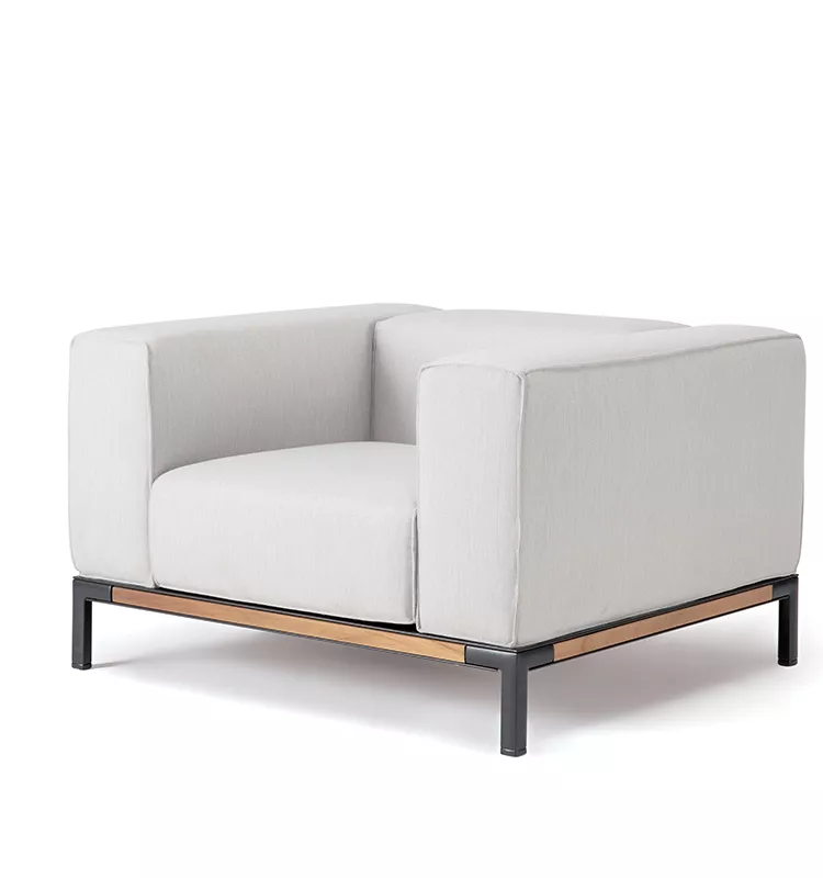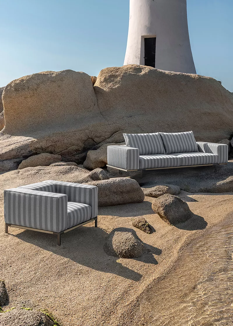 Die Costiera Sitzmöbel zeichnen sich durch großzügige Armlehnen und eine einhüllende Polsterung aus, die den Wunsch nach großem Komfort mit den spezifischen funktionalen Anforderungen der maritimen Umgebung verbindet.