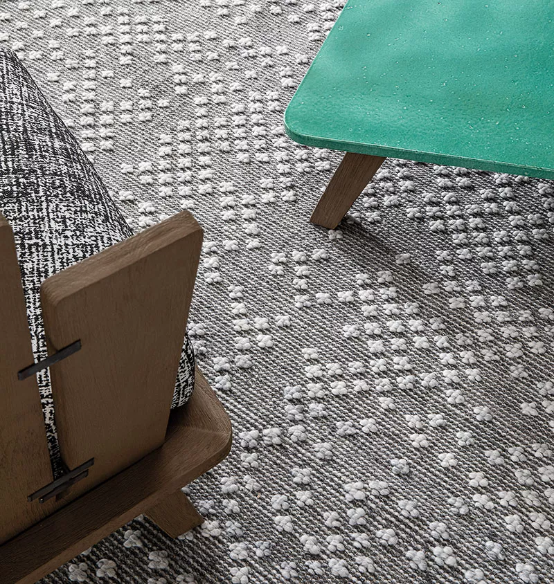 Diese Kollektion von Outdoor-Teppichen entstand aus der bezaubernden Tradition des kunsthandwerklichen Webens“, erklärt Paola Navone. „Weich und dick werden diese Teppiche mit Makrogarnen in drei verschiedenen Farbtönen hergestellt. Das Kornweben erzeugt abstrakte geometrische Muster in derselben Farbe im Gewebe. Ihr poetischer, leicht abgenutzter Effekt erzählt von dem Lebensgefühl, das in einer mediterranen Seele verankert ist.