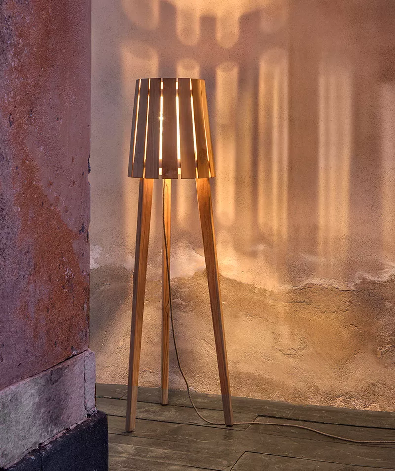 Woody ist der Name, der die „Substanz“ der neuen Lampe verkörpert, die von Ethimo und Marc Sadler entworfen wurde. Dieses Einrichtungsaccessoire mit klarem, raffiniertem Design bringt abends gedämpftes Licht in Gärten und auf Terrassen und entfaltet tagsüber seine gesamte dekorative Kraft. In einem ausgewogenen „Gespräch“ zwischen Form und Funktion ist Woody vollständig aus natürlichem Teakholz (FSC-zertifiziert) gefertigt, hat eine doppelte warme LED-Birne, eine kabelgebundene Stromversorgung und ist 152 cm hoch. Seine ungewöhnliche, schlanke „Dreibein“-Struktur hält einen Schirm, dessen Volumen durch den „Rhythmus“ der dicht aneinander liegenden Streifen bestimmt wird, die das Licht filtern und streuen und dabei spektakuläre Effekte erzeugen.