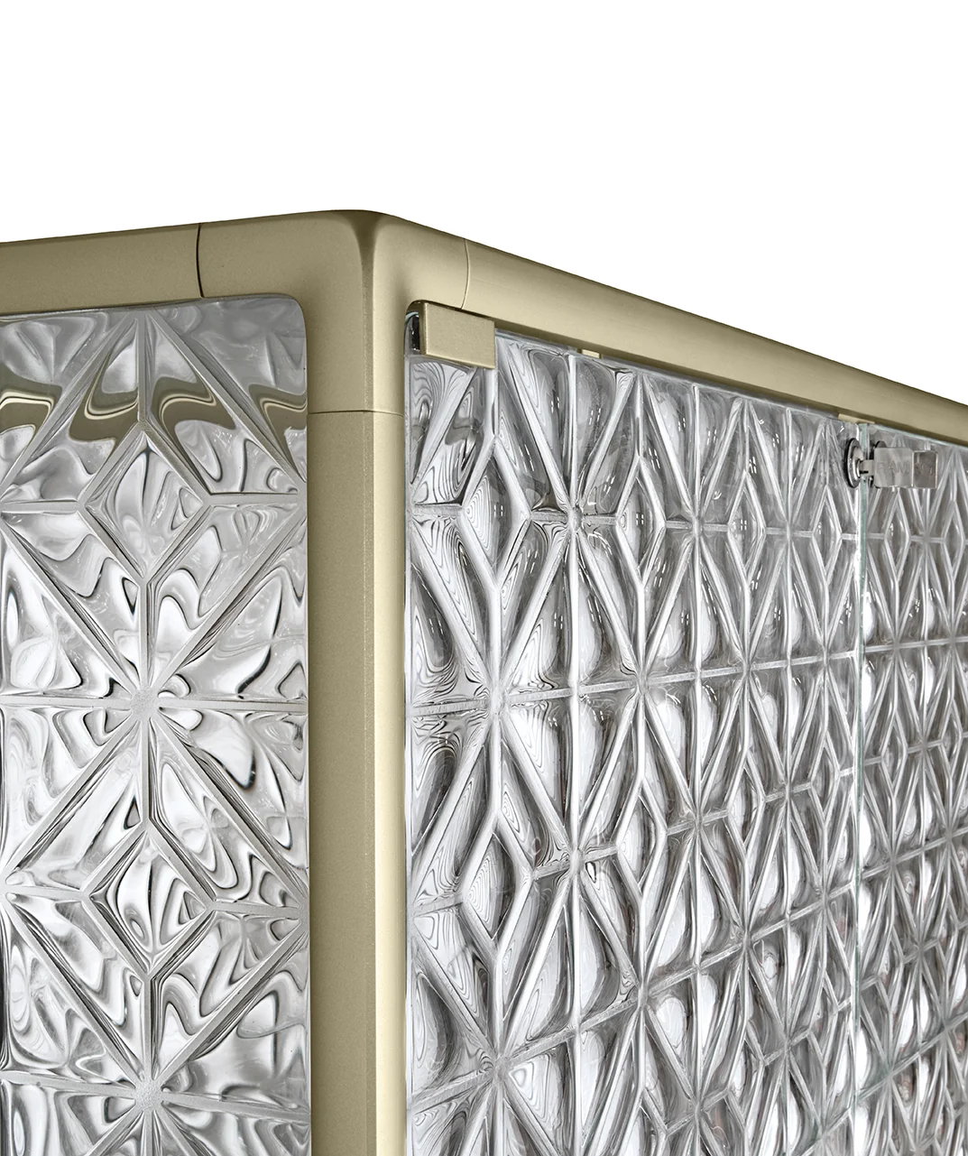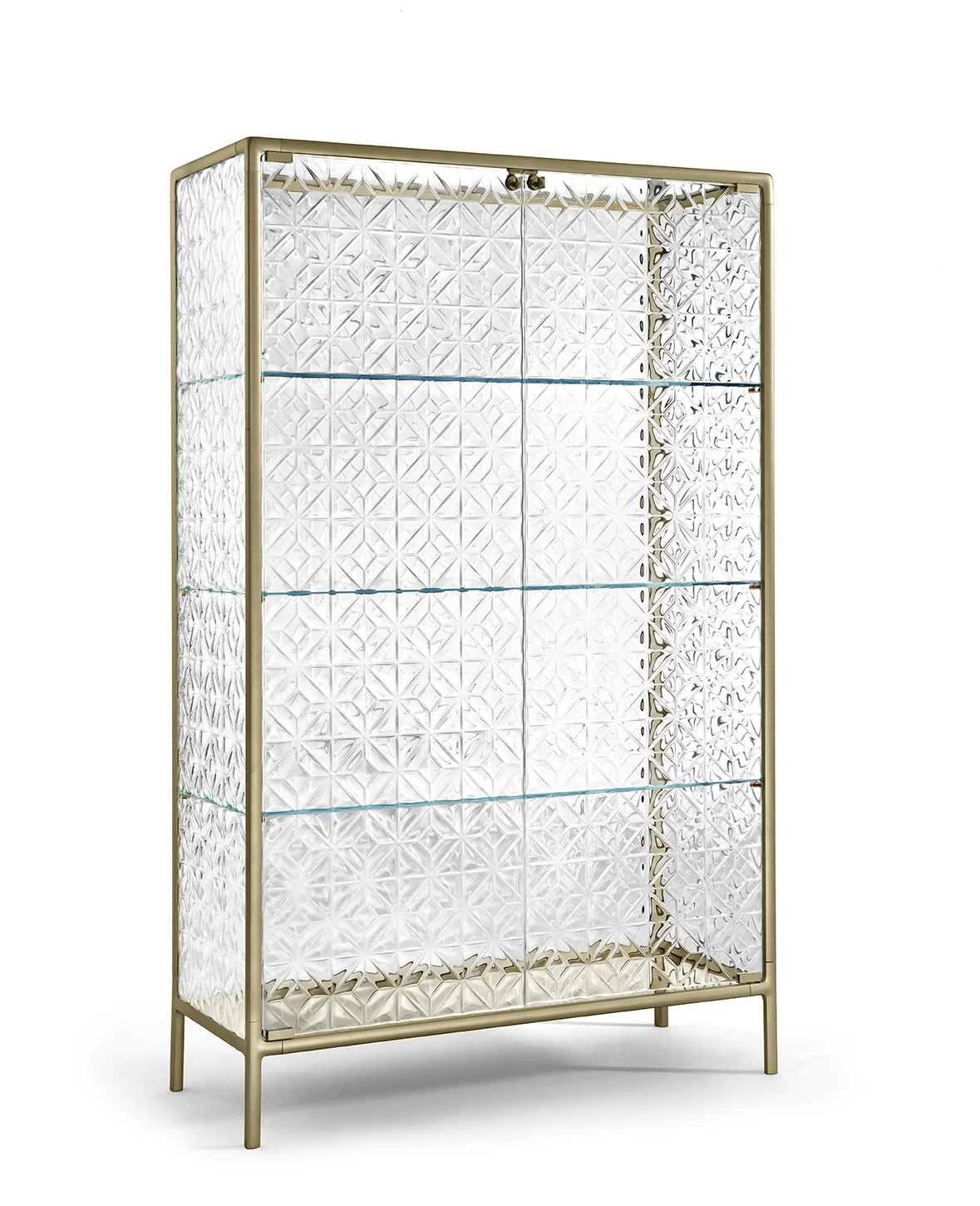 FIAM PALLADIO Vitrine Interessieren Sie sich für die Vitrine in einer anderen Ausführung? Unser Kundenservice hilft Ihnen gerne weiter und berät Sie persönlich – wir freuen uns auf Ihre Anfrage!PALLADIO Vitrine – Design von VITTORIO LIVIElegante Glasvitrine für stilvolle Präsentationen. Diese hochwertige Vitrine aus 6 mm starkem, gebogenem Sicherheitsglas setzt Ihre Exponate perfekt in Szene. Vier fest integrierte Glasfachböden (ebenfalls 6 mm stark) bieten reichlich Platz für eine übersichtliche und ansprechende Präsentation. Der stabile Glasdeckel aus 12 mm starkem Glas sorgt für eine edle Optik und zusätzliche Stabilität. Die formschönen Profile aus gebürstetem, glänzendem Aluminium unterstreichen das moderne Design. Für zusätzliche Sicherheit ist die Glastür mit einem Schloss ausgestattet. Besonders praktisch: Auf Wunsch kann eine Beleuchtung installiert werden, um Ihre Produkte optimal in Szene zu setzen. Sie haben die Wahl zwischen: Basis aus 12 mm starkem extralight Glas, versilbert. Profile Alu-lackiertSockel aus 12 mm starkem extralight Glas, schwarz lackiertSockel aus 12 mm starkem extralight geätztem Glas weiß lackiert Sockel aus Walnussholz und Vitrinenstruktur aus extralight GlasMögliche Varianten der Vitrinen Struktur (Sockel ausgenommen): Extralight GlasDas Beleuchtungsset besteht aus 2 LED-Leuchten hohe Helligkeit 3 W, 1 Transformer niedriger Stärke. CE-Zertifizierung nur für europäische Länder verfügbar.Maße (L x B x H in cm): 64 x 37 x 166 cm