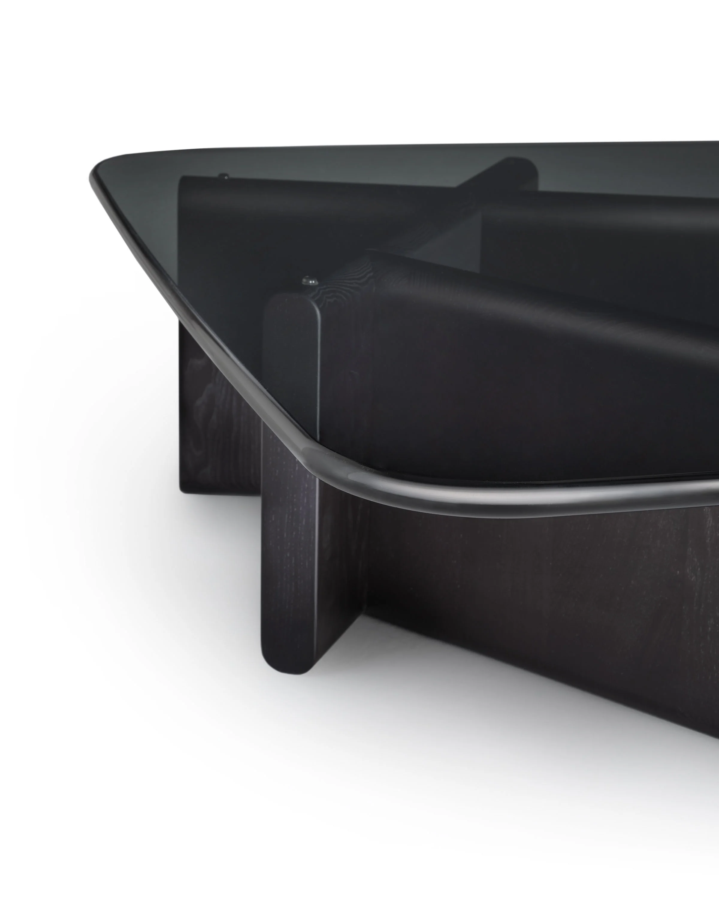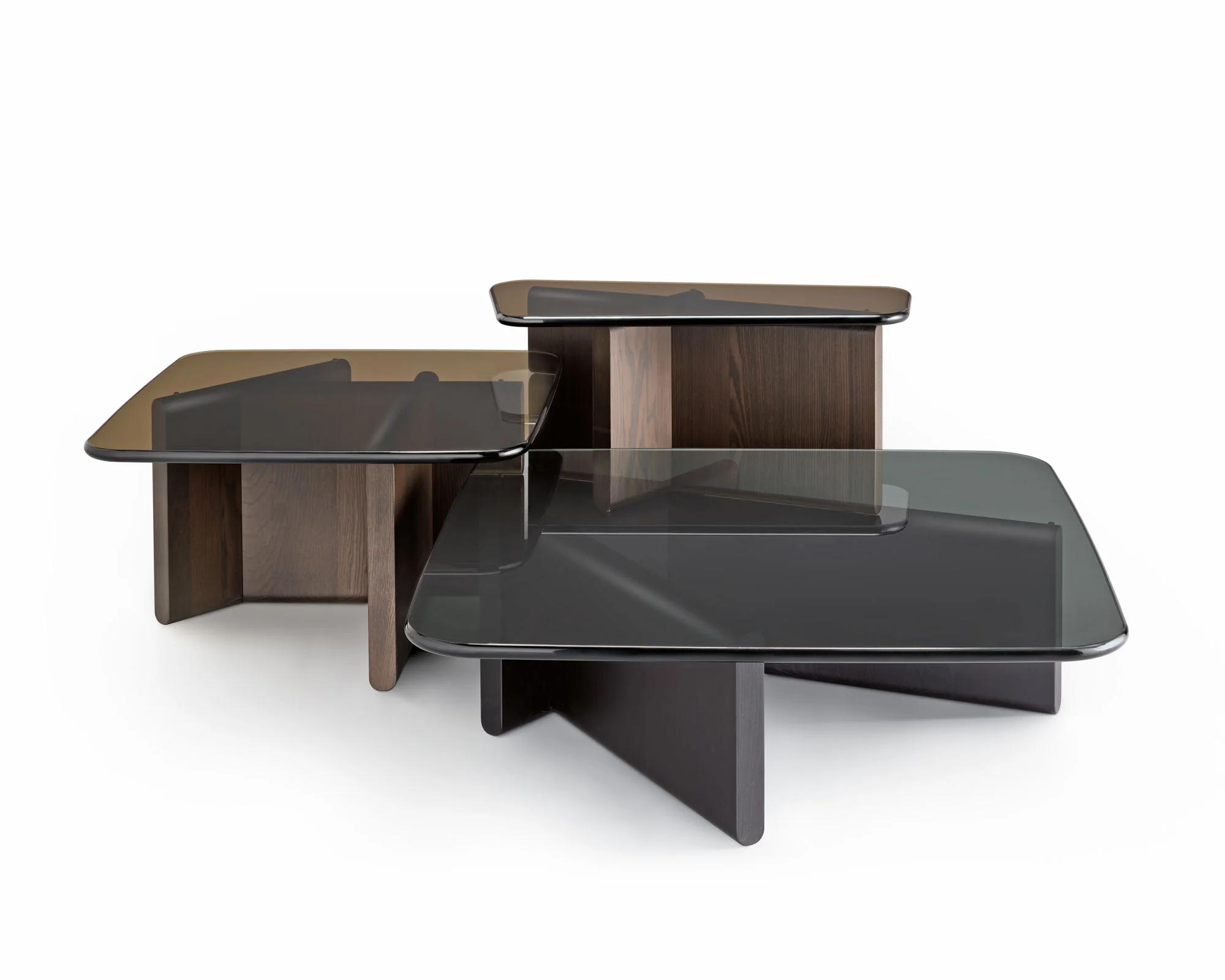 - Couchtisch mit geschichteter Glasplatte (Bronze / Rauch) und Massivholzsockel (Tabak / Schwarz)