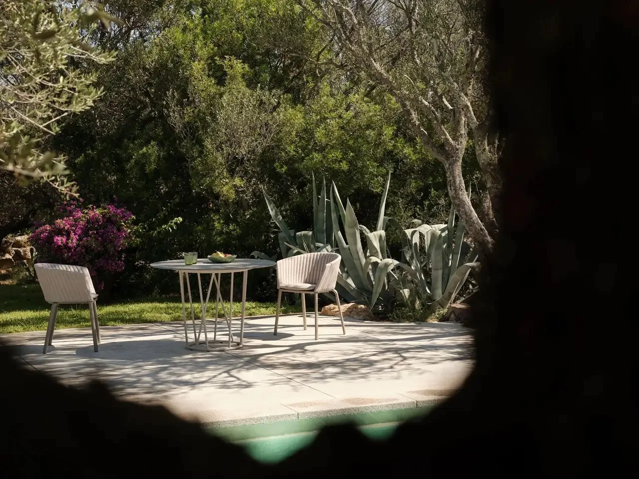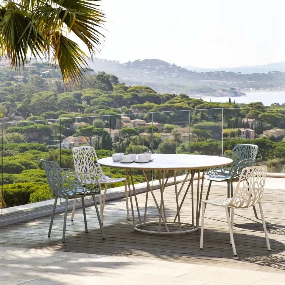 Ein Name, der an Savannen und unberührte Natur erinnert: Die Struktur der Wild-Kollektion erinnert an die Muster miteinander verflochtener Zweige inmitten eines dichten Waldes. Diese Kollektion von Esstischen, niedrigen Tischen und Hockern bewahrt eine große formale und stilistische Kohärenz und verleiht jedem Raum einen exotischen Touch. Das lackierte Aluminium macht diese Tische und Sitzpuffs widerstandsfähig gegen Wind, Regen und durch die Sonne verursachte Farbveränderungen. Die abnehmbaren Kissen sorgen für zusätzlichen Komfort und gleichzeitig für praktische Anwendbarkeit. Die Wild-Kollektion umfasst: Esstische, niedrige Tische und Sitzpuffs.