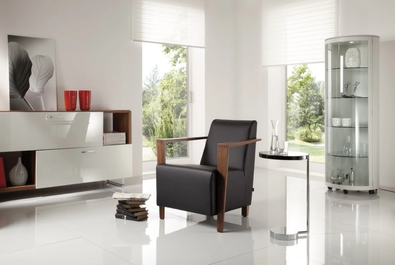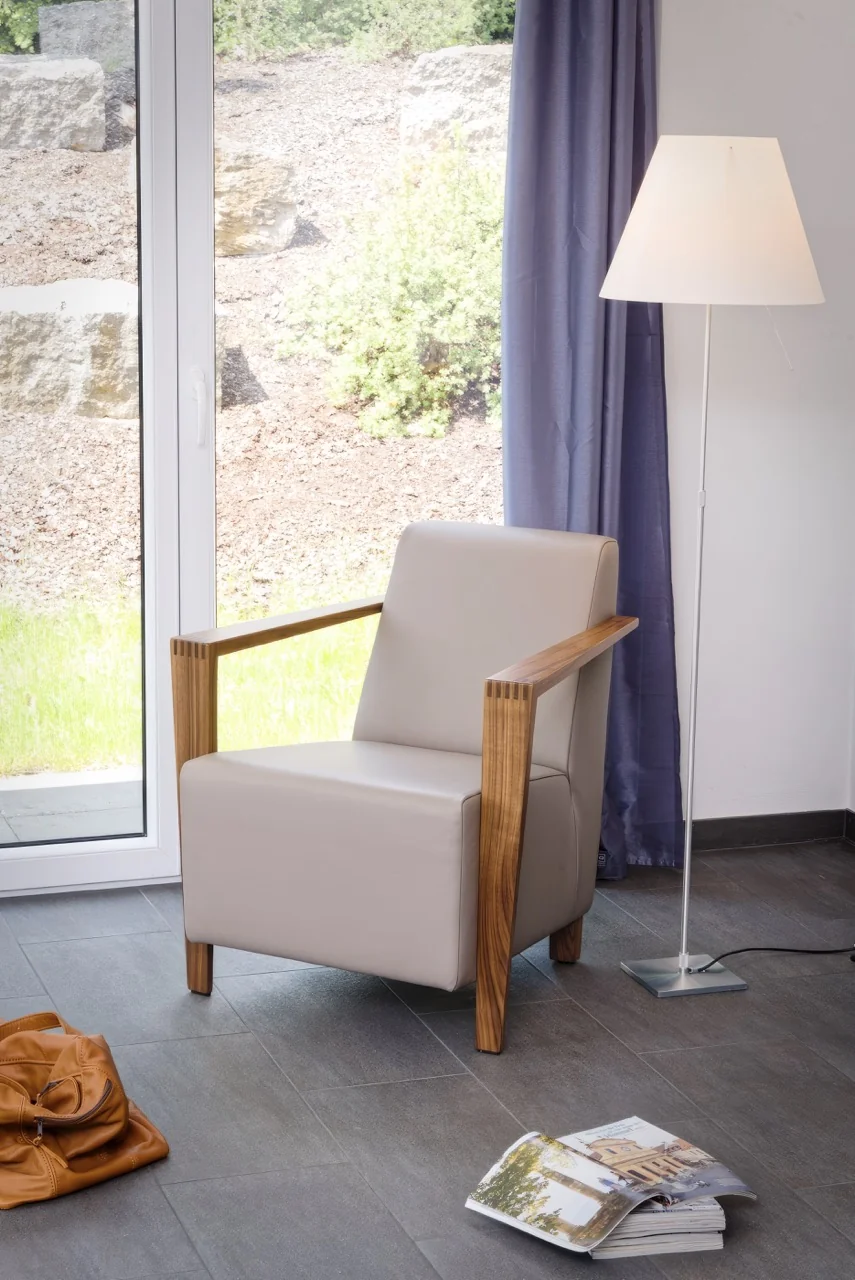Ein besonderes Highlight sind die Armlehnen aus Massivholz, die wahlweise in Buche oder Nussbaum ausgeführt werden können. Die sorgfältig gearbeitete Holzverbindung, entweder stumpf oder gezinkt, unterstreicht die hochwertige Verarbeitung und verleiht dem Sessel eine elegante Note.